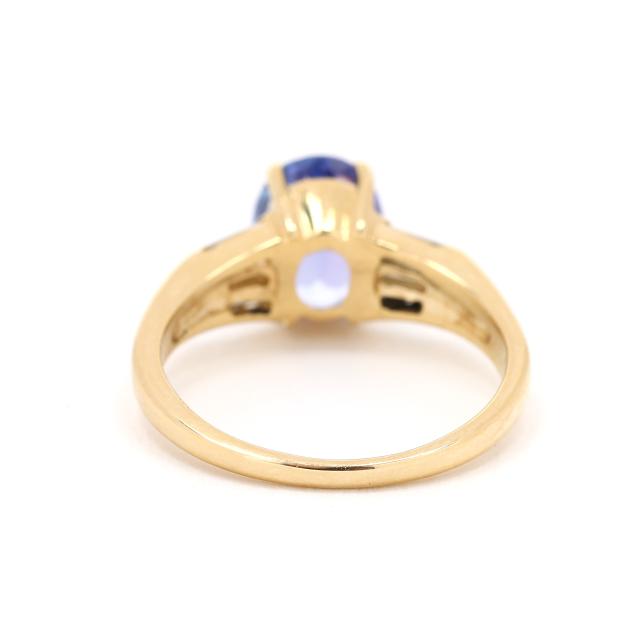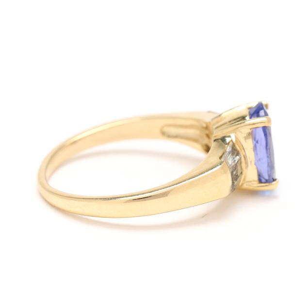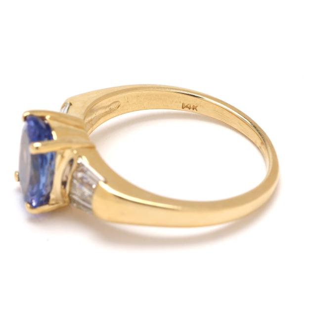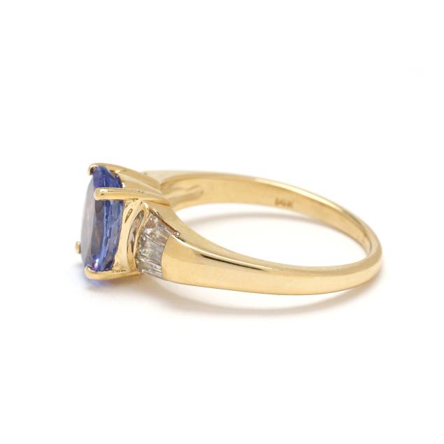 Centered on an oval cut tanzanite (9 x 7mm) weighing approximately 2.0 carats, the shoulders set with tapered baguette cut diamonds weighing approximately .30 total carats (G-H color, VS2-SI1 clarity), on a tapering shank, stamped 14K.