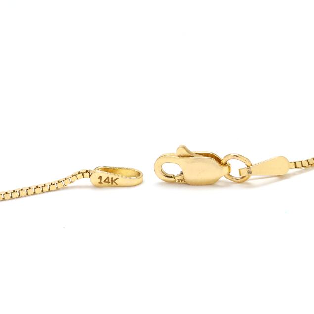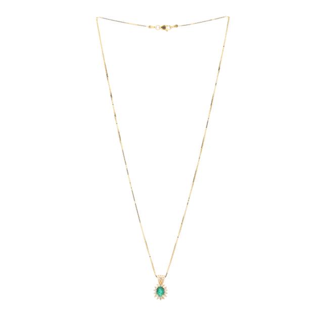 Pendant centered on an oval cut emerald weighing approximately .80 carat, the halo and bail set with full cut round diamonds weighing approximately .25 total carat (I-J color, SI2-I1 clarity), testing 14KT, suspended from a box chain completed with a lobster clasp stamped 14K.