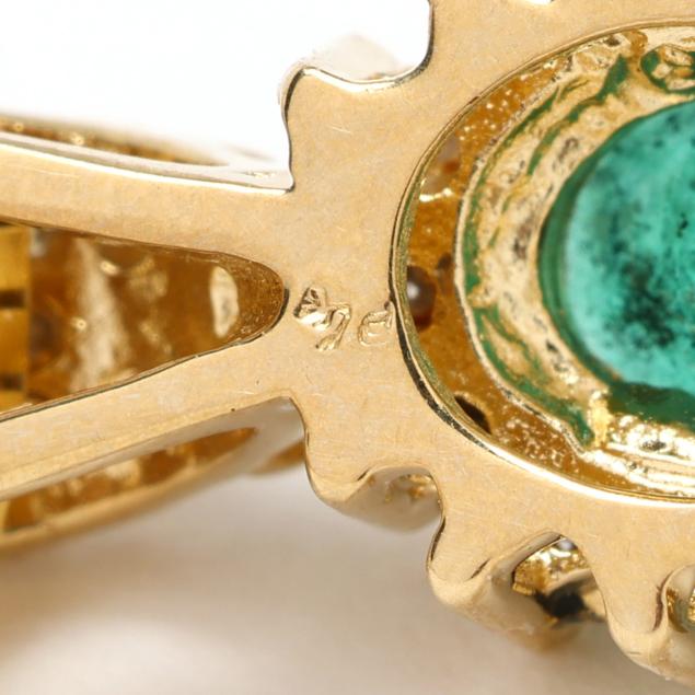 Good estate condition; emerald with surface-reaching fracture and a few diamonds with minute nicks, all visible under 10x magnification.