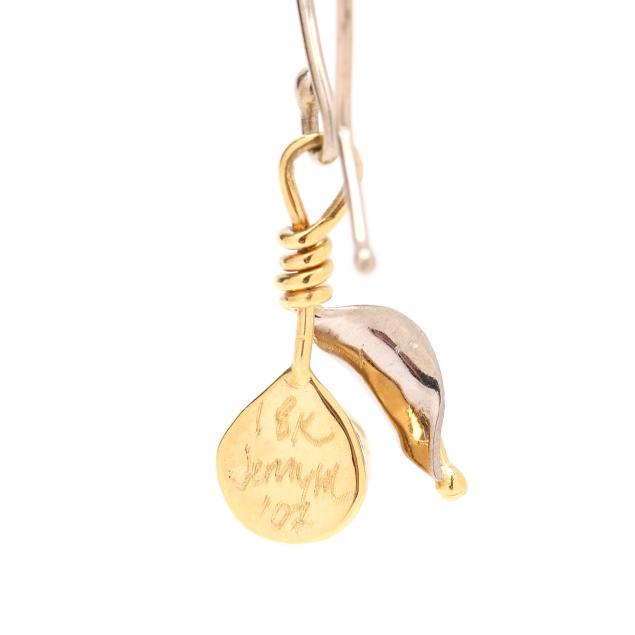 The white and yellow gold setting with a leaf drop and a collet set round cultured pearl, completed with an ear wire, signed Jenny M, dated, and marked 18K.