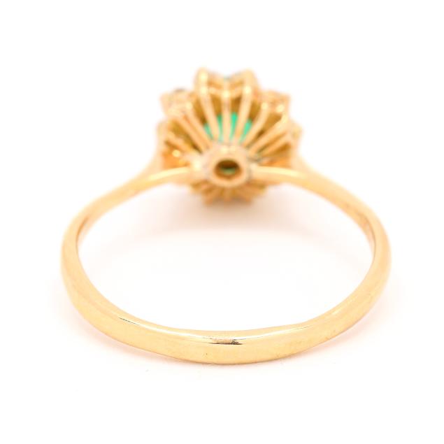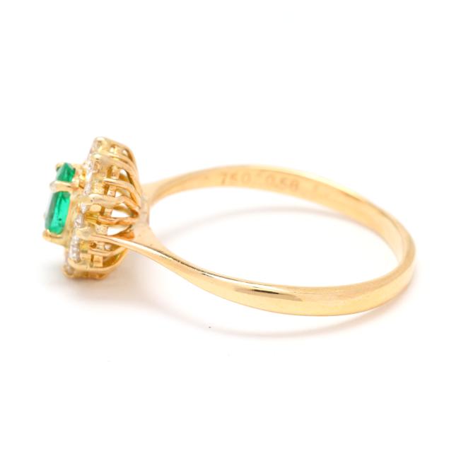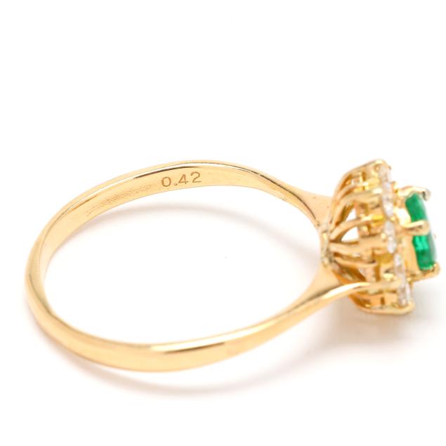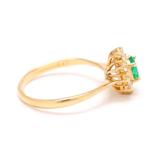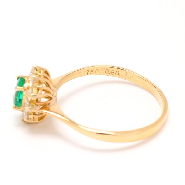 Centered on a prong set oval cut emerald (5.5 x 3.75mm) weighing approximately .35 carat within a halo of full cut round diamonds weighing approximately .42 total carat (H-I color, SI1-SI2 clarity), on a delicate shank, stamped 750 and 0.58 0.42.