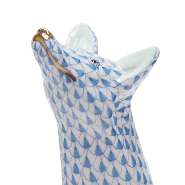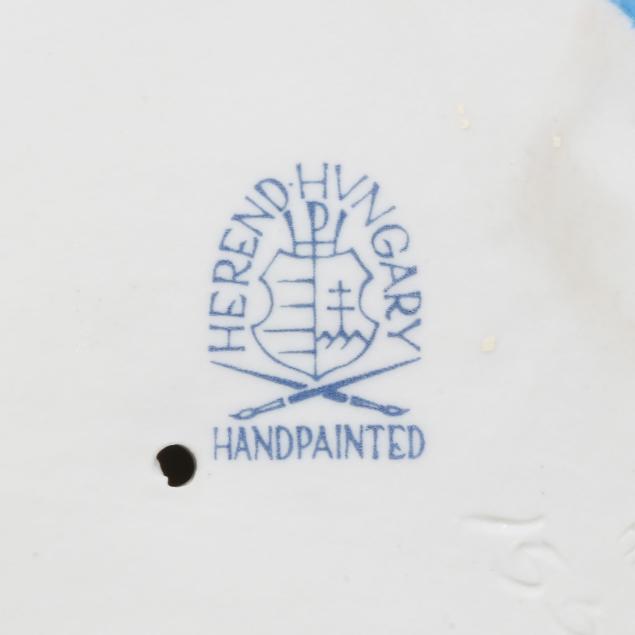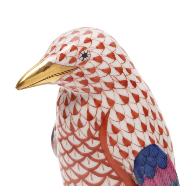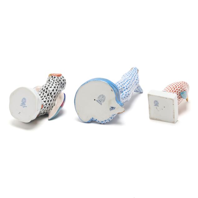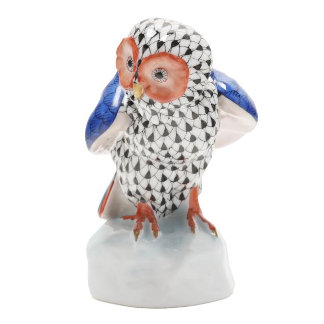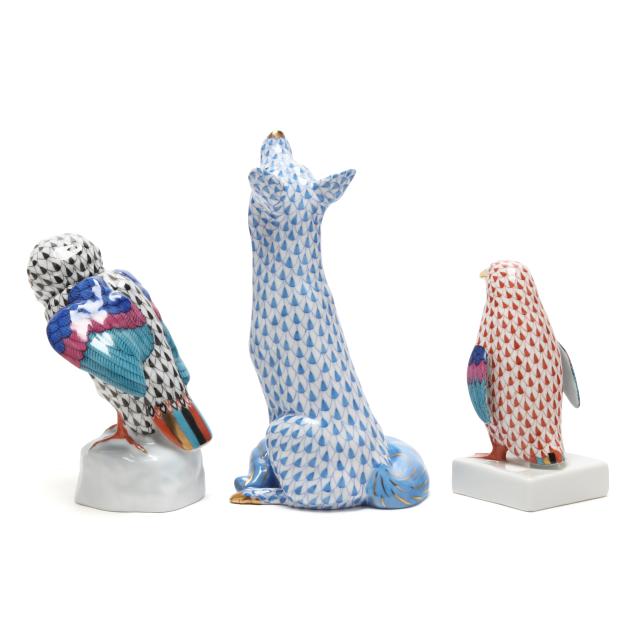 Hungary, late 20th century, hand-painted and gilt porcelain, including a #15303 blue fishnet fox (6 5/8 x 3 5/8 x 3 1/2 in.); a #5106 black fishnet owl (4 3/4 x 3 1/2 2 3/4 in.); and a #5176 rust fishnet penguin (4 1/4 x 2 x 2 3/4 in.), all marked with company backstamp to underside.