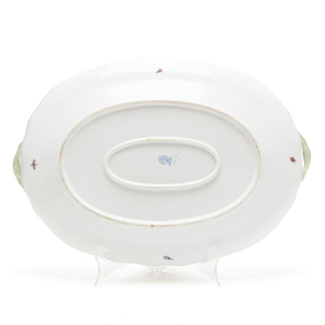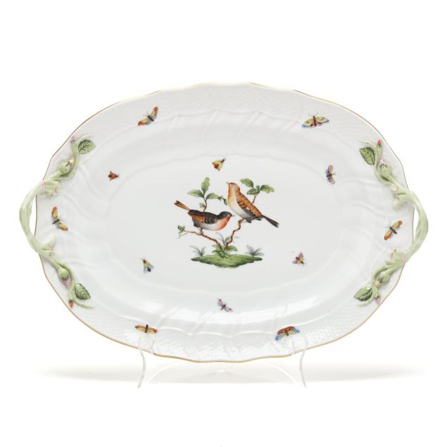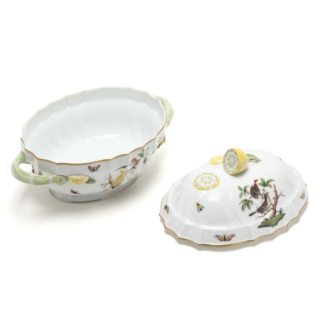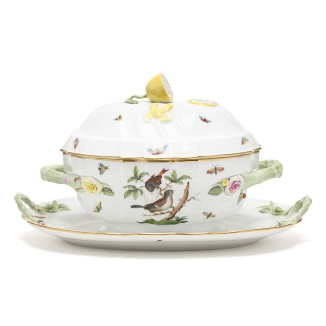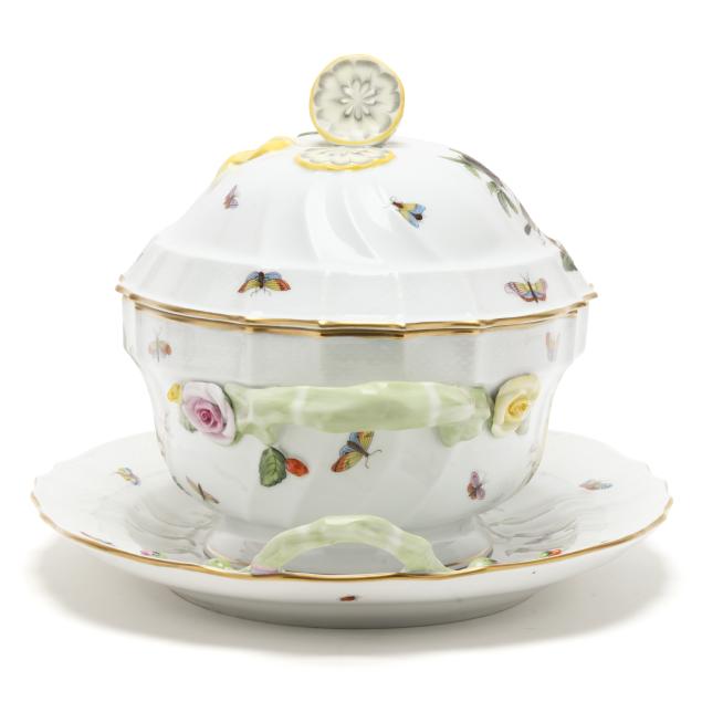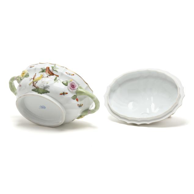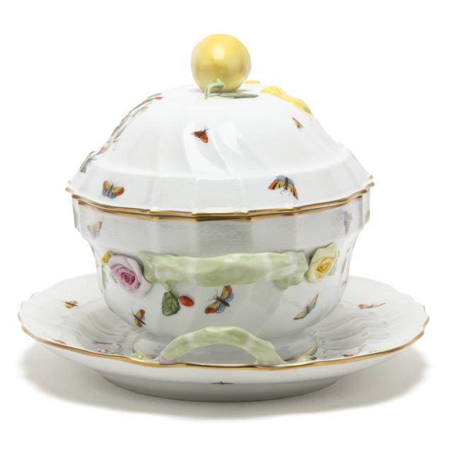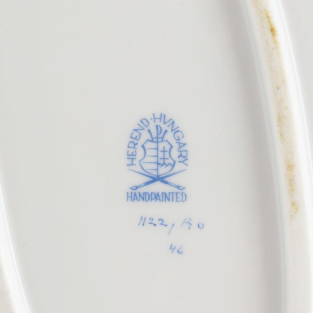 Hungary, hand-painted and gilt porcelain, including a #1014 lidded oval tureen with lemon finial (8 3/4 x 13 1/4 x 8 in.); and a #1122 oval handled platter (16 x 11 x 2 1/2 in.), both with company backstamp to underside.