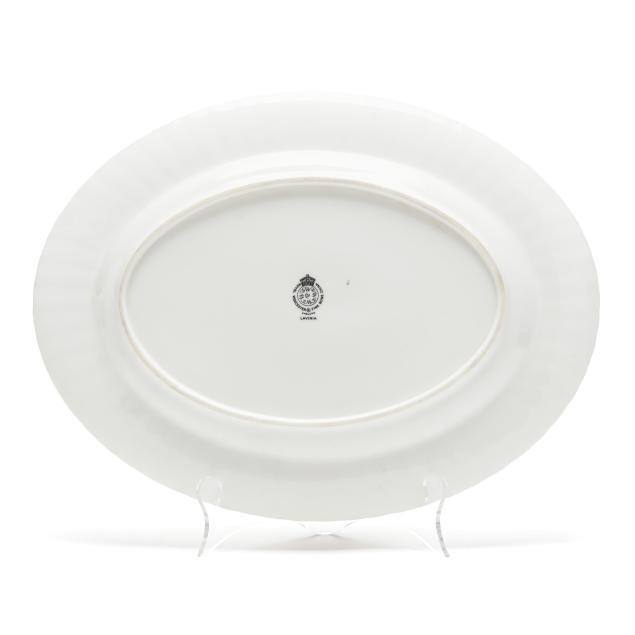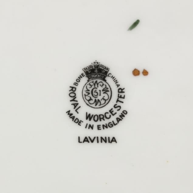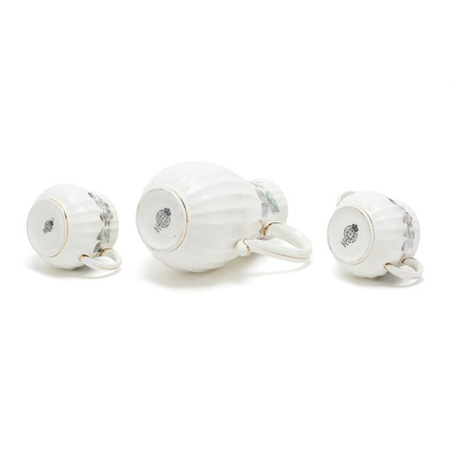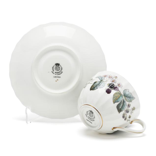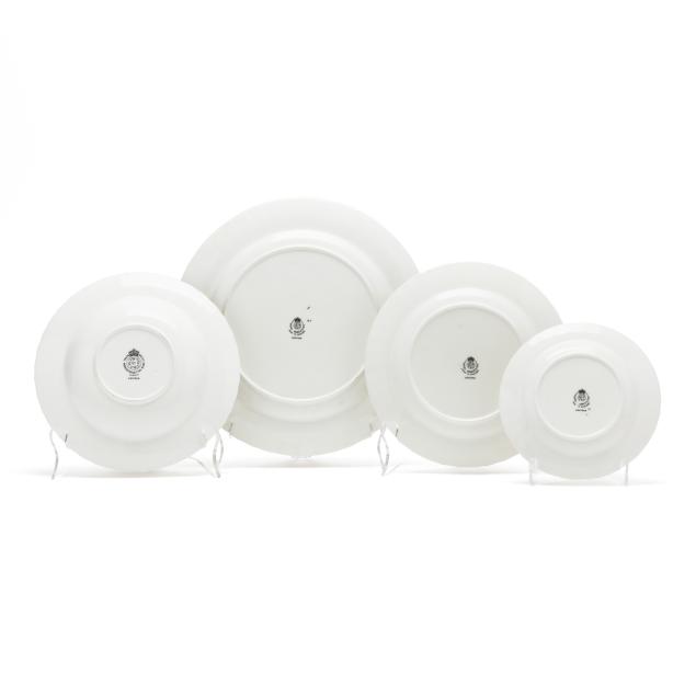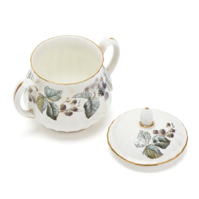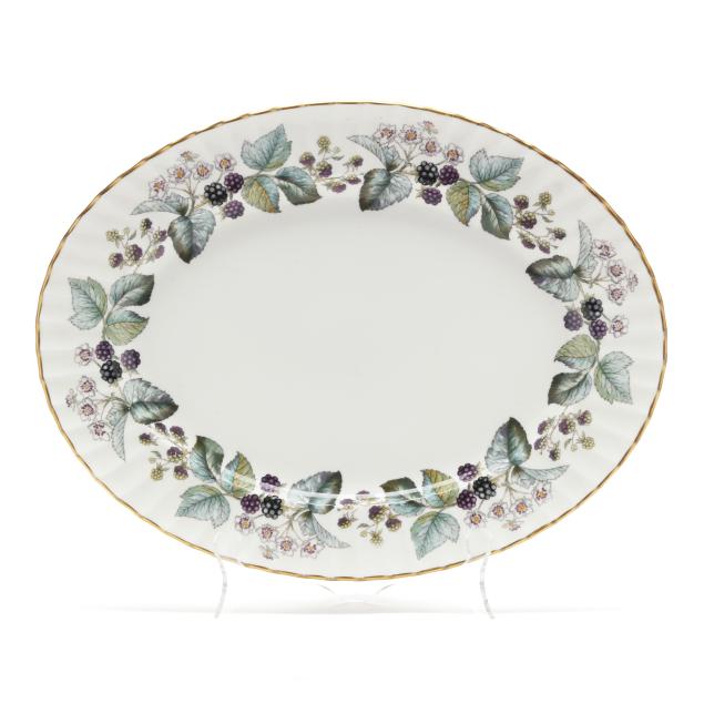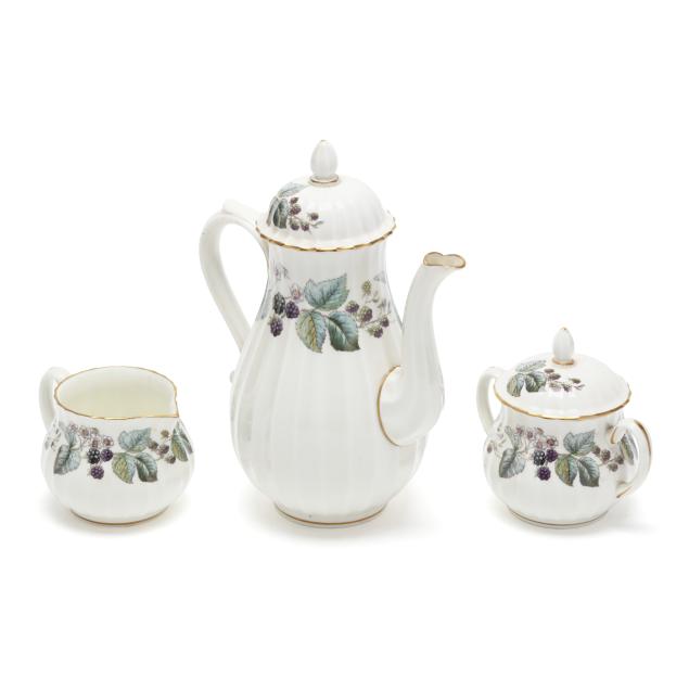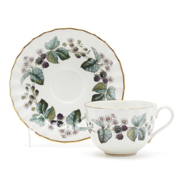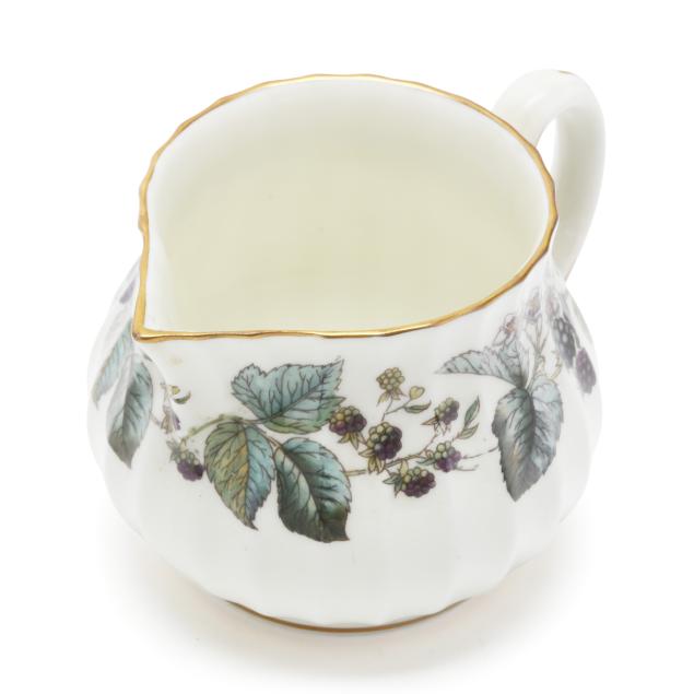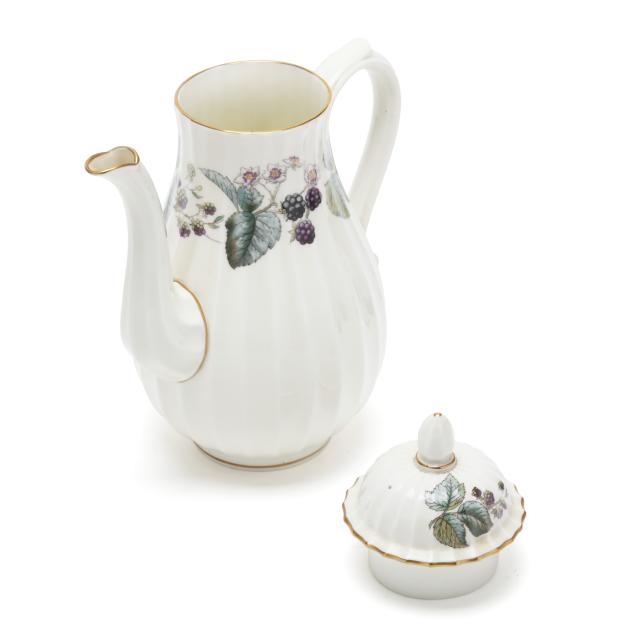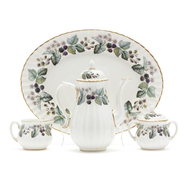 (129) pieces, England, late 20th century, discontinued pattern featuring budding blackberries and ruffled rim with gilt trim, including (24) dinner plates (10 1/4 in. diameter); (24) salad plates (8 in.); (24) bread and butter plates (6 1/8 in.); (6) rimmed soup bowls (1 1/2 x 8 in.); (23) flat cups (2 1/2 x 4 1/4 x 3 1/2 in.) and (24) saucers (5 3/4 in.); (1) oval serving platter (11 3/4 x 15 1/4 x 1 1/4 in.); (1) lidded coffee pot (10 x 8 1/4 x 4 3/4 in.); (1) creamer (3 1/8 x 4 7/8 x 3 3/4 in.); and (1) dual handled lidded sugar (5 x 5 1/4 x 3 1/2 in.), all marked with company backstamp to underside.