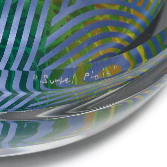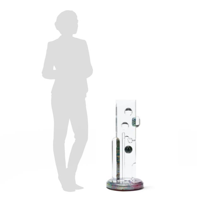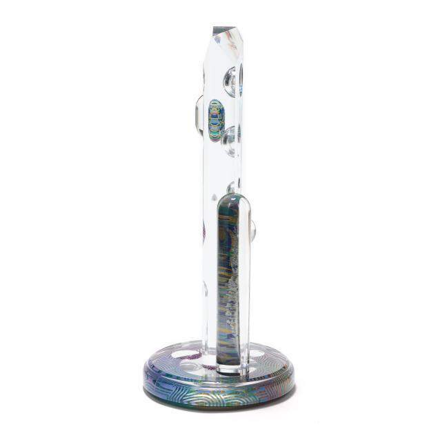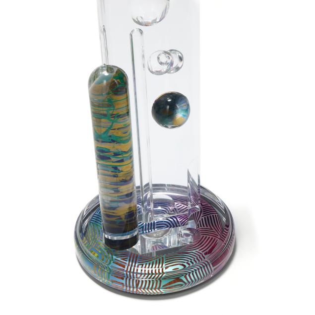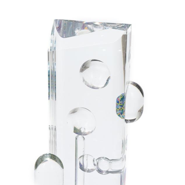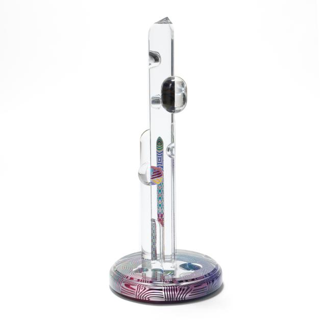 Acrylic tower sculpture, signed and titled along the integral swivel base edge.