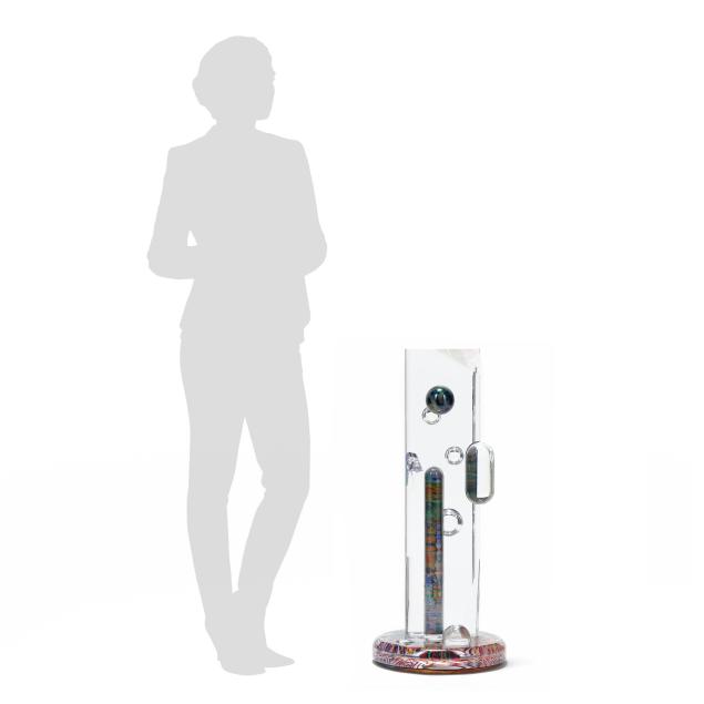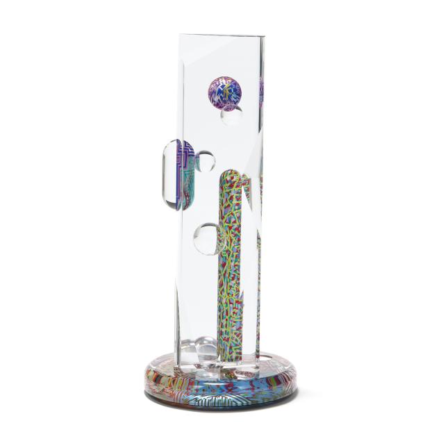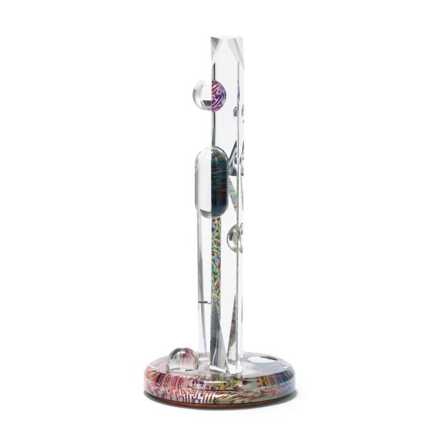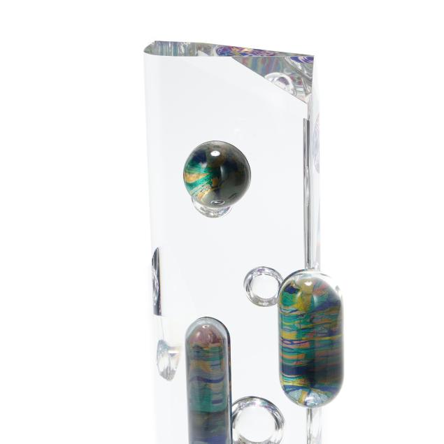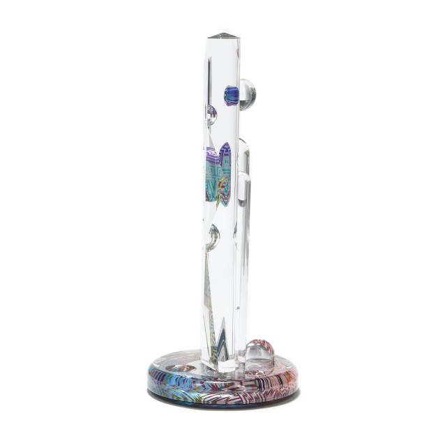 Acrylic tower sculpture, signed and titled along the integral swivel base edge.