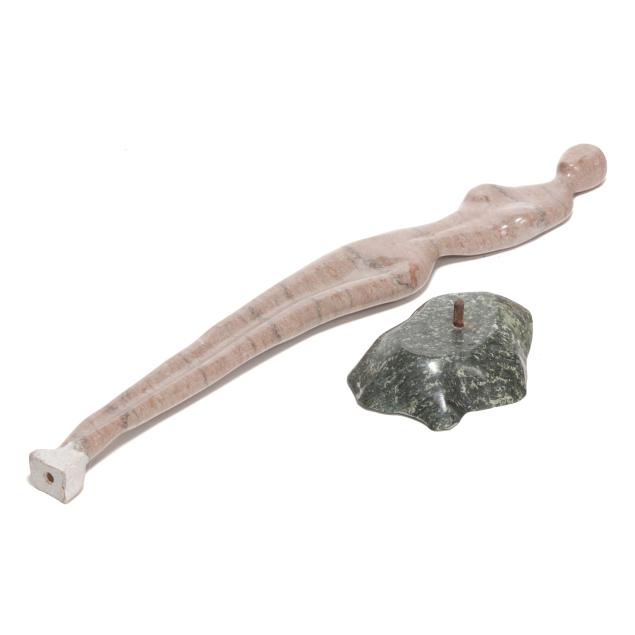 Carved and polished pale pink and green marble, two part form, signed to the base.