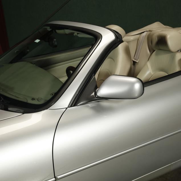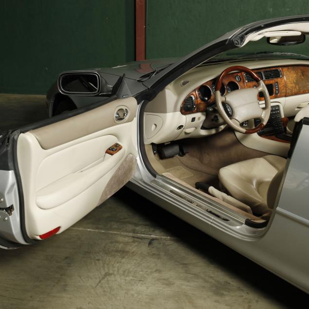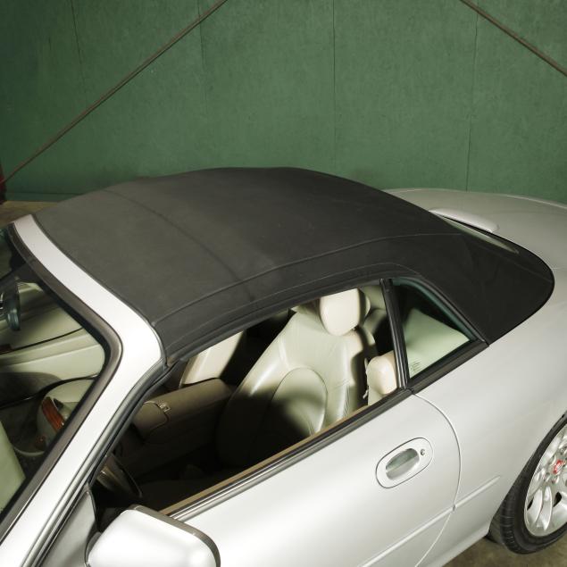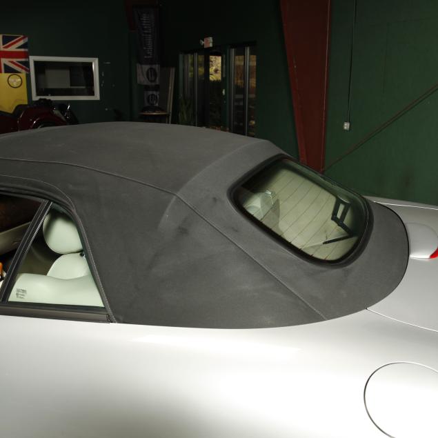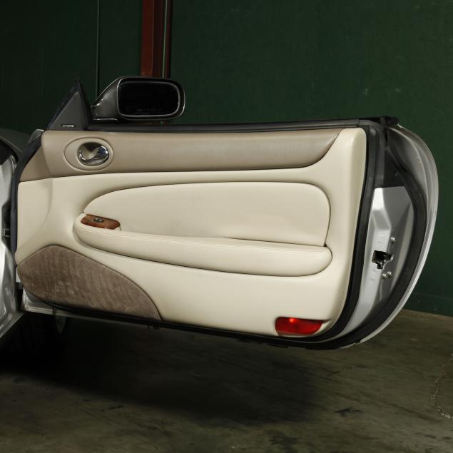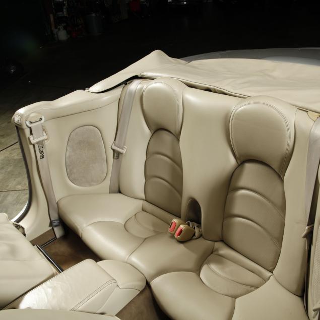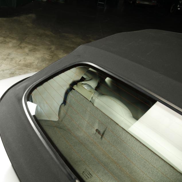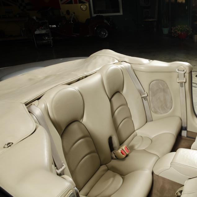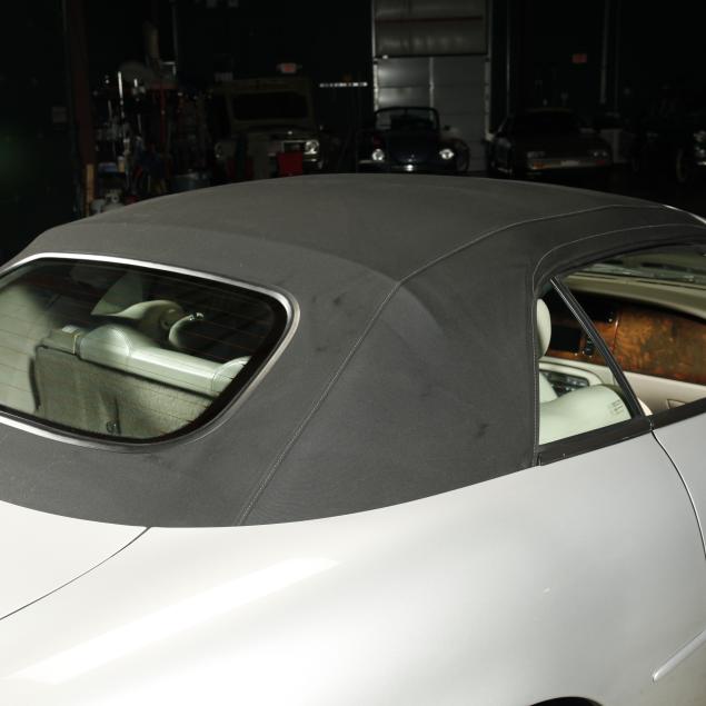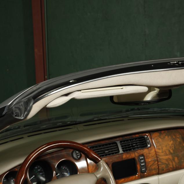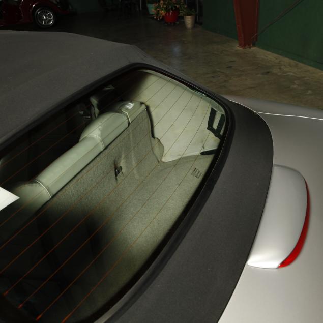 Exterior paint in Platinum Metallic (MDZ), and a premium leather interior in Oatmeal (AGD) with burl walnut trim and wool carpet. The power convertible top is in black fabric, and features a boot cover, as well as a quick tonneau for travel situations. Also with a premium car cover.