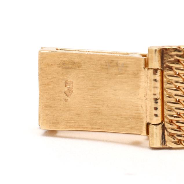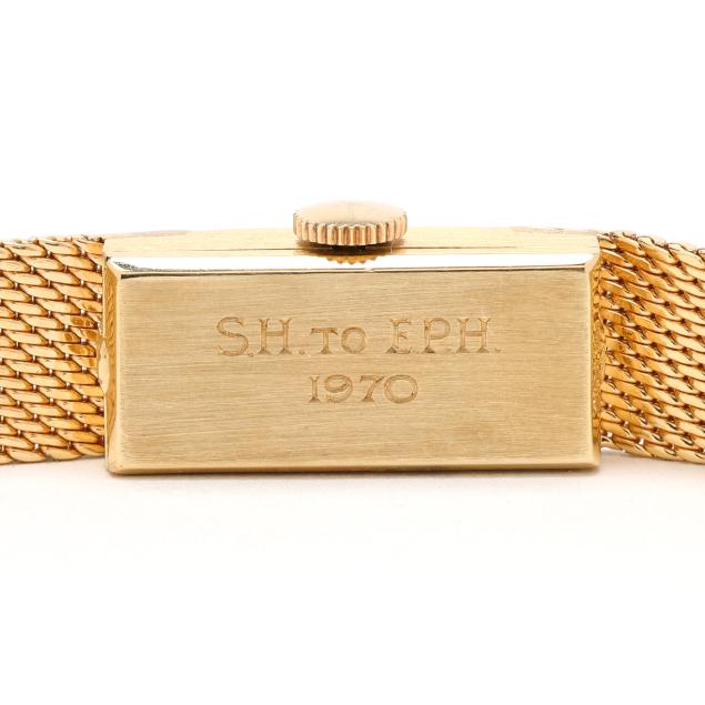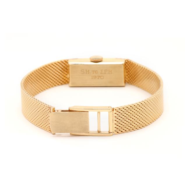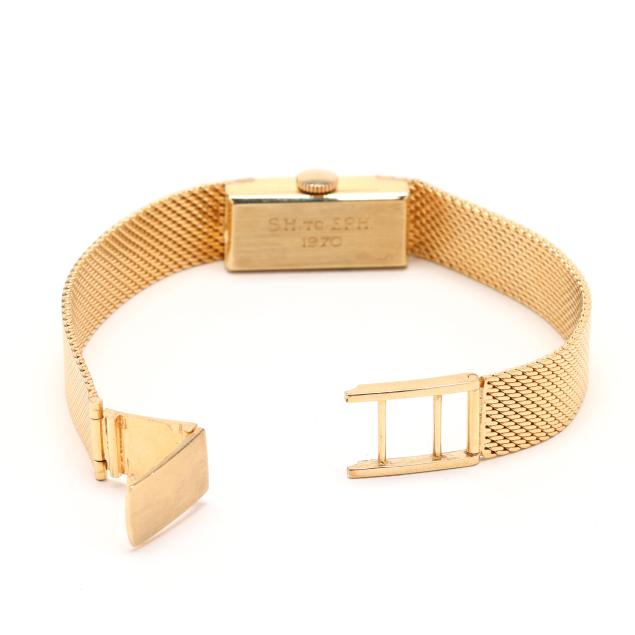 Circa 1970, manual wind, Girard-Perregaux 75, reference number T110, serial number 369450, the rectangular gold case with polished bezel, the signed silver-tone dial with gold-tone baton hour markers and gold-tone stick hands, the integrated gold mesh bracelet with fold-over clasp stamped 14K, the caseback with presentation engraving S.H. to E.P.H. / 1970, and stamped 14K Gold.