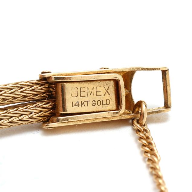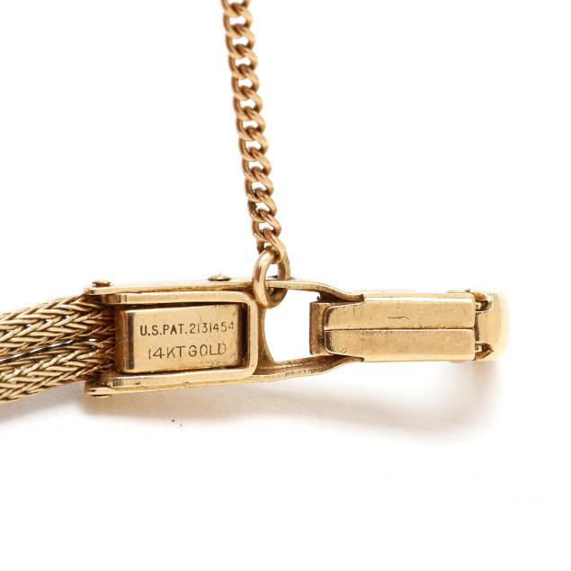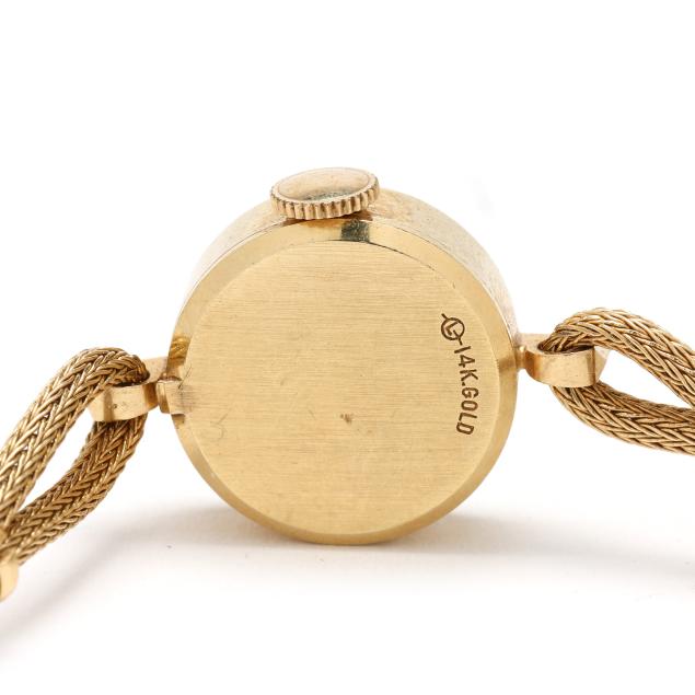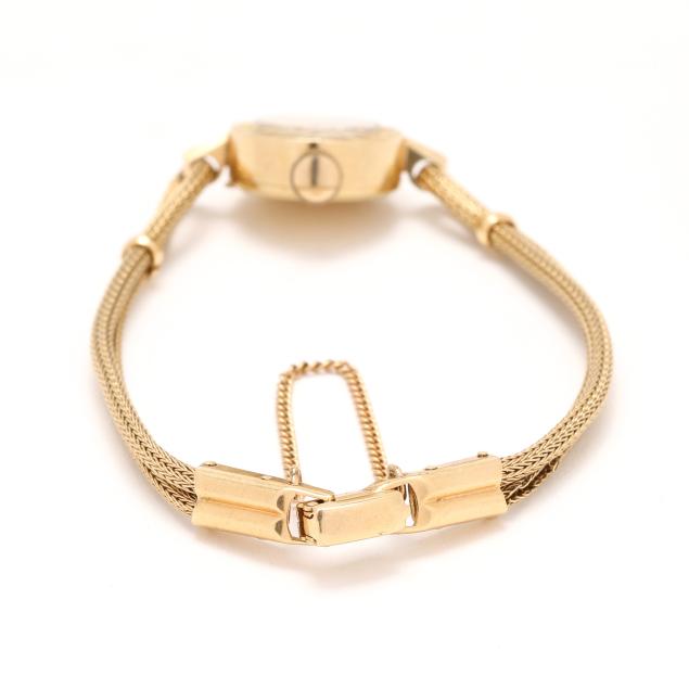 Manual wind, Movado 6, reference number 4RE43, serial number 32, the round gold case with Florentine finish and baton hour markers to bezel, the signed gold-tone dial with gold-tone dagger hands, the gold wire mesh bracelet with gold fold-over clasp and safety chain, stamped 14KT Gold, the caseback stamped 14K Gold.