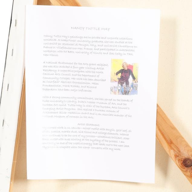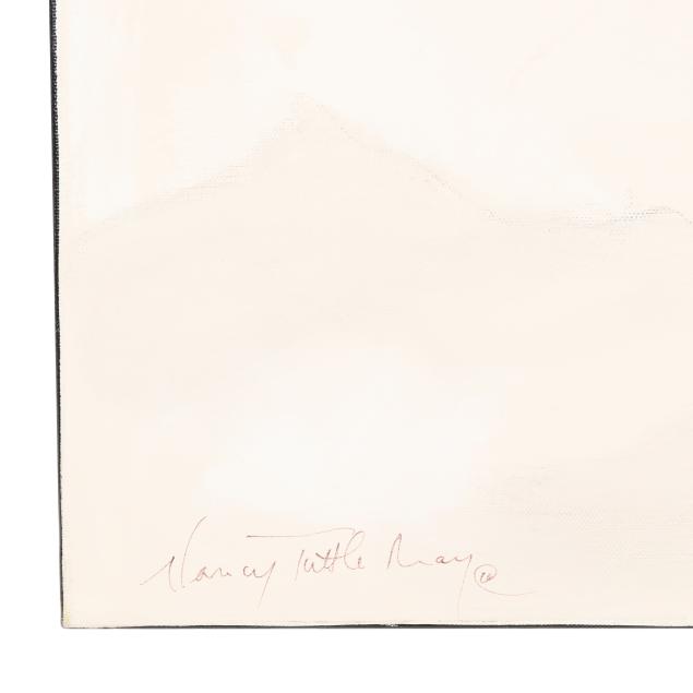 Nancy Tuttle May has been a fixture in the arts community of Durham, North Carolina for many years. She studied at Wake Forest University, and later at the Università per Strainieri di Perugia, Italy, and Université Canadienne en France in Villefranche-sur-Mer, France, before returning to the United States to live and practice. Tuttle May's works - abstract and color field in style - are present in many collections, including the Duke University Medical Center, Durham; Weatherspoon Art Museum, Greensboro; SAS Institute, Cary; Nations Bank, United States, and Australia; and The Breakers, Palm Beach.