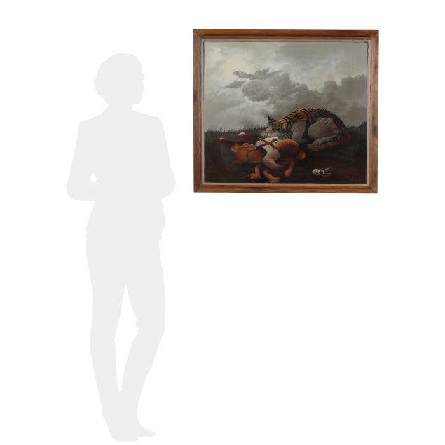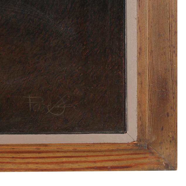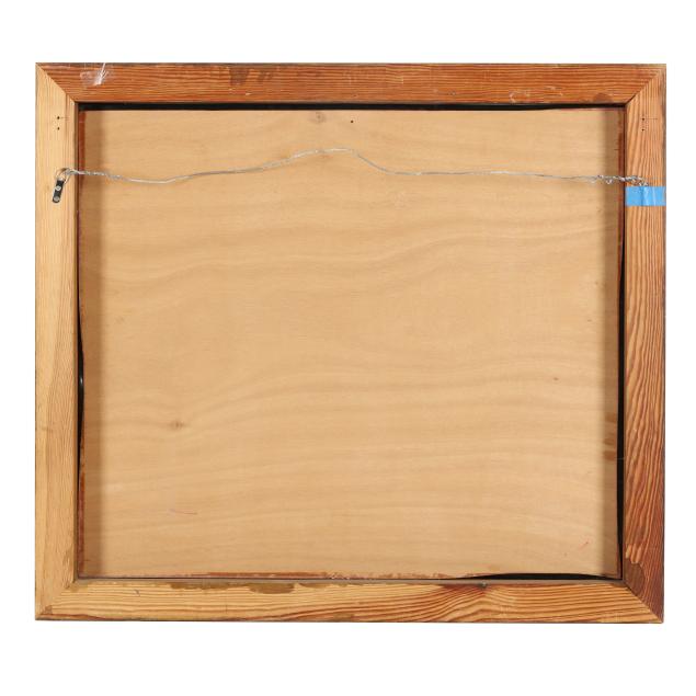 A tight horizontal crazing line to the surface of the painting at the top left quadrant, minimally noticeable to the eye at normal viewing distance. A black tape is affixed to the outer edge of the board to protect the painting from the frame. A portion of this tape in the upper right corner has come loose and is visible beyond the inner edge of the frame. Overall in good estate condition.