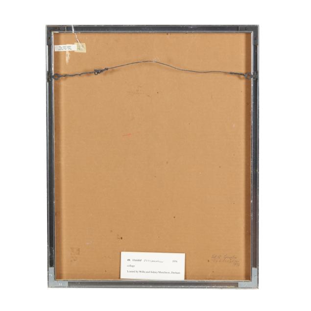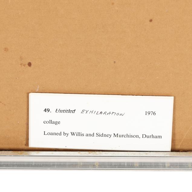 Mixed media collage and pastel on heavy paper, 1976, pencil signed at lower right, retaining artist and exhibition labels to verso, framed below glass.
