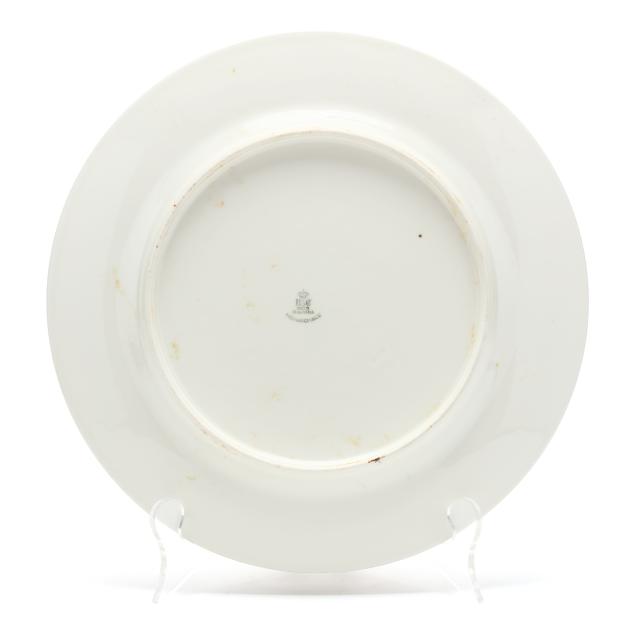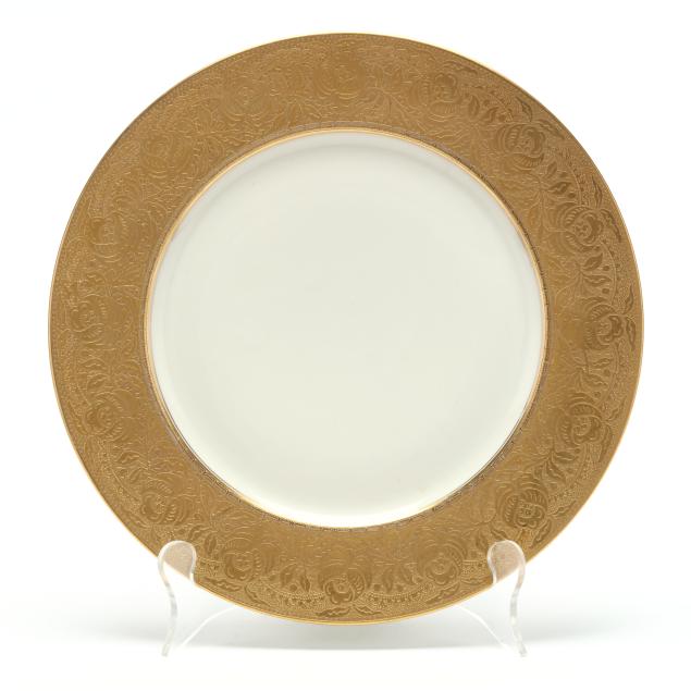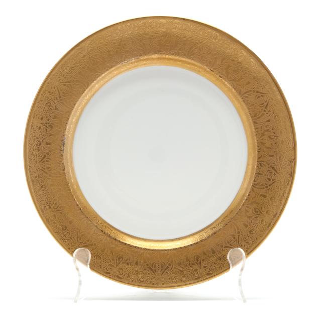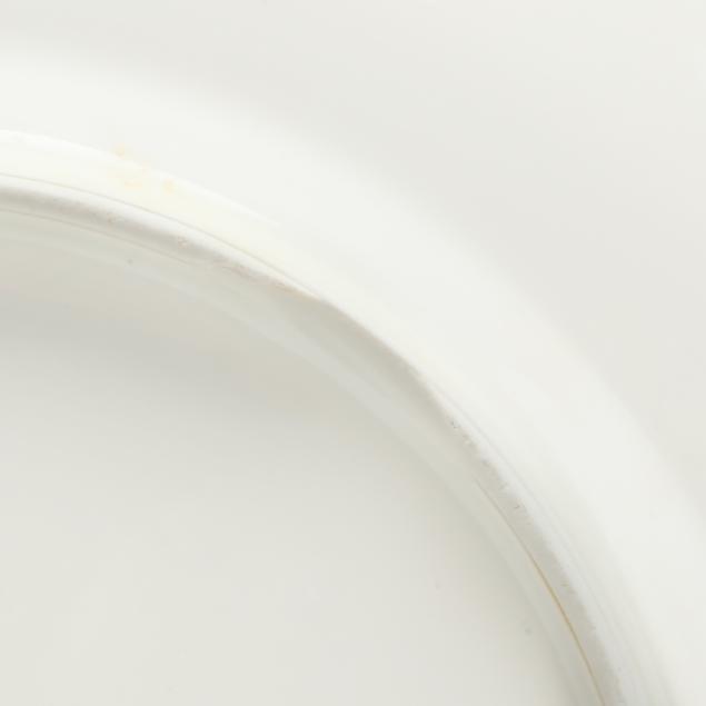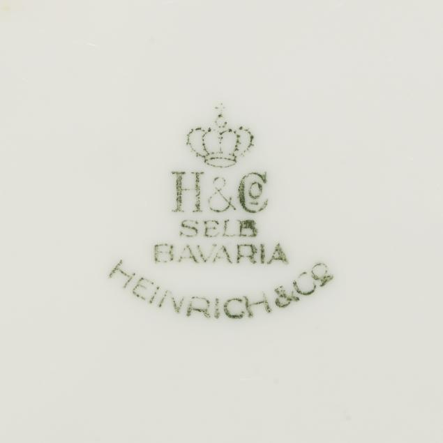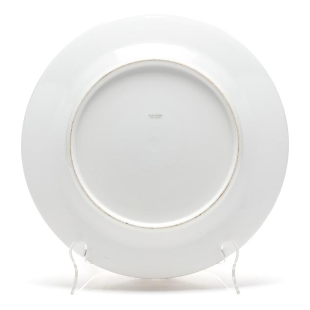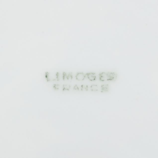 From the Collection of Adrienne and John C. Maxwell, Jr. One Limoges plate with small area of adhesive residue to well, another with light gilt rubbing, another with fleabite to rim; one Heinrich & Co. plate with smoothed chip to foot rim; several Heinrich & Co. plates with staining to underside.