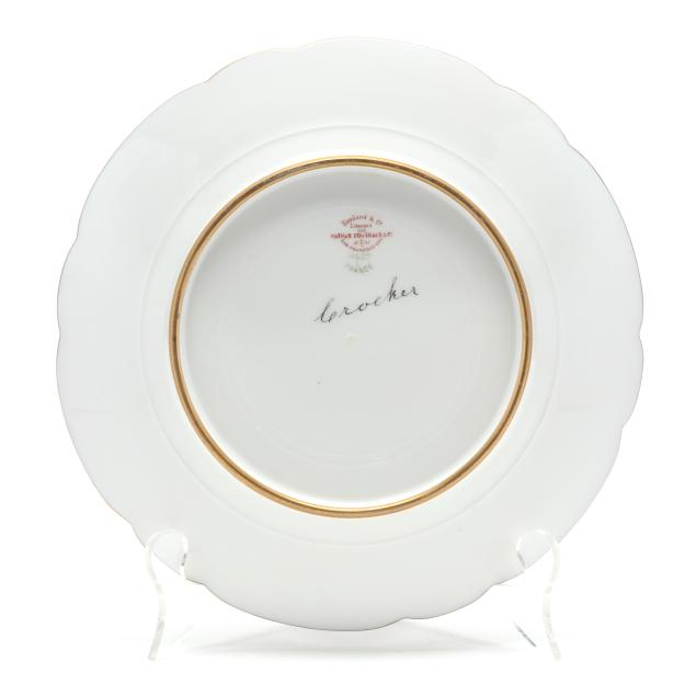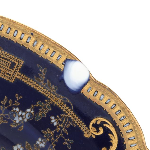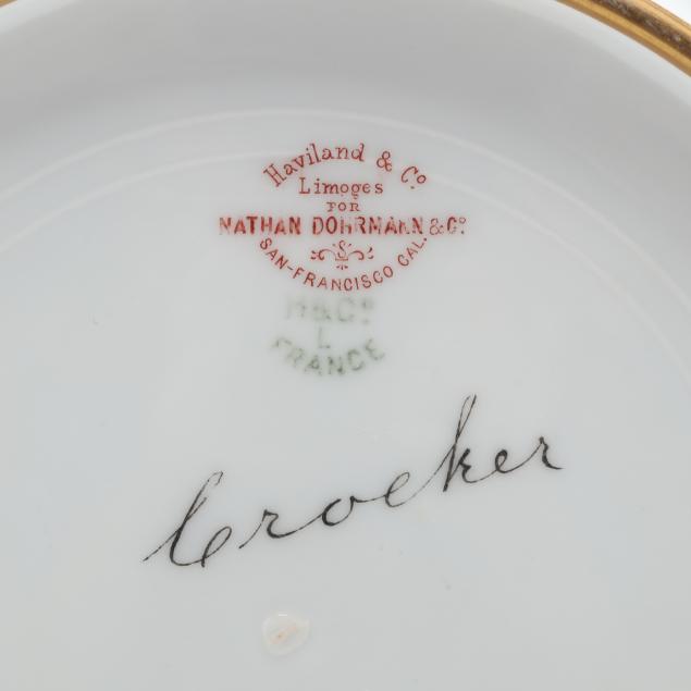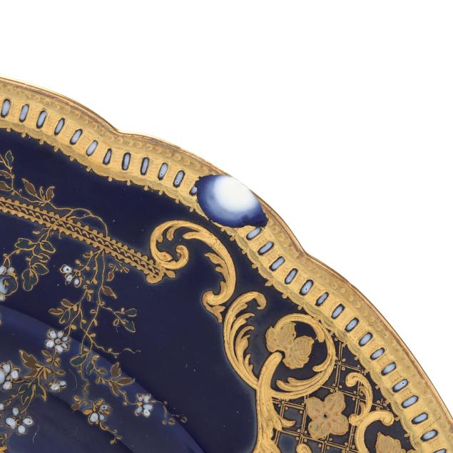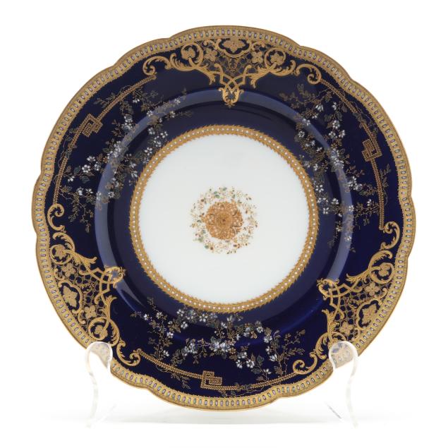 France, 1888-1896, retailed by Nathan Dohrmann & Co. of San Francisco, CA, each plate with scalloped rim, intricate gilt encrusted floral and foliate designs over a cobalt ground, each marked with company backstamp to underside and "Crocker."