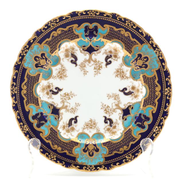 England, 1900, each featuring ornately decorated cobalt and teal rims with gilt accents, all marked to underside.