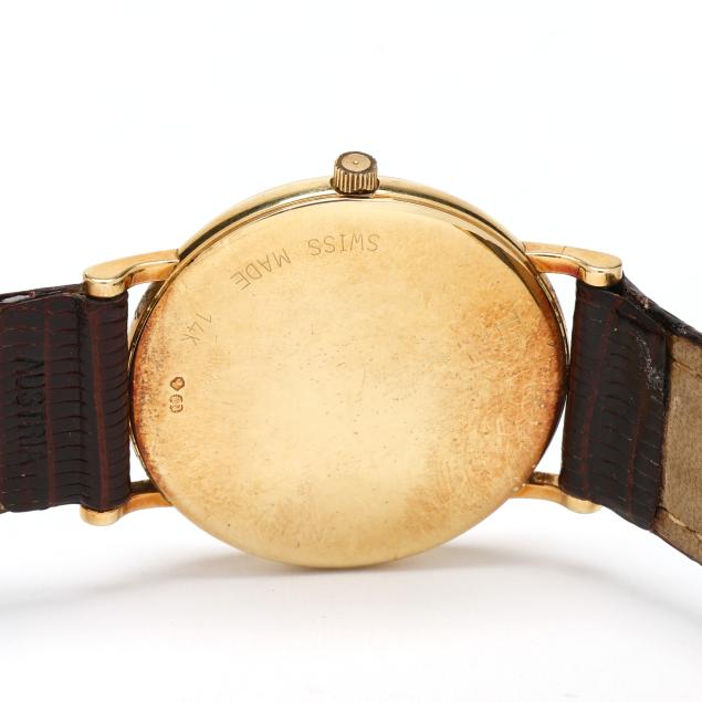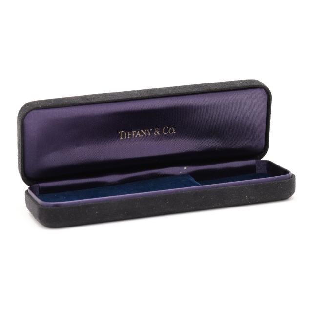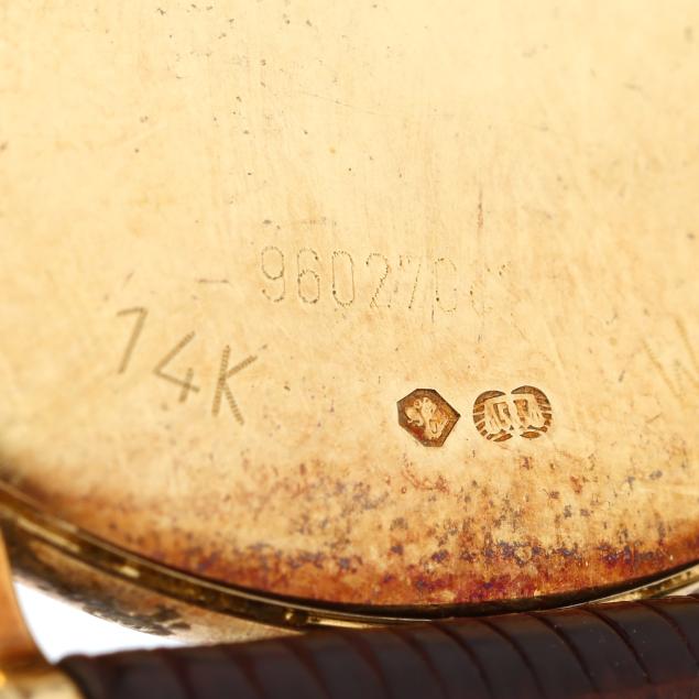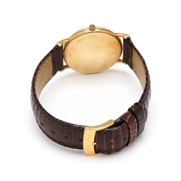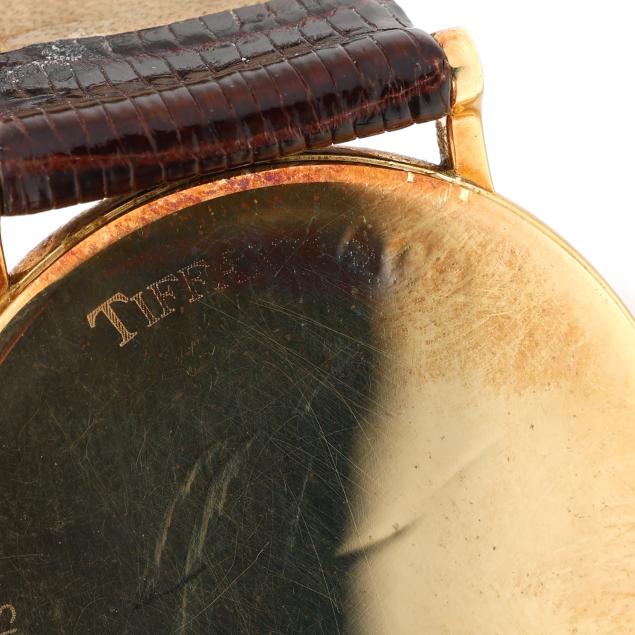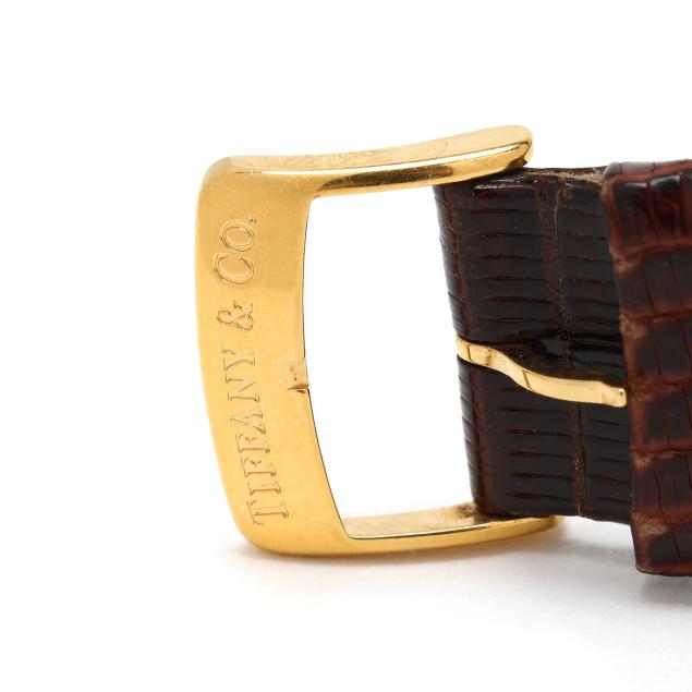 Quartz, ETA 255.441, the round gold case with polished bezel, the signed white dial with black Roman numeral hour markers, and black leaf hands, the brown lizard strap signed Tiffany & Co., completed with a signed gold-tone buckle stamped Plaq G 10M, the caseback signed, with partial serial number, and with Swiss hallmarks for 14KT.