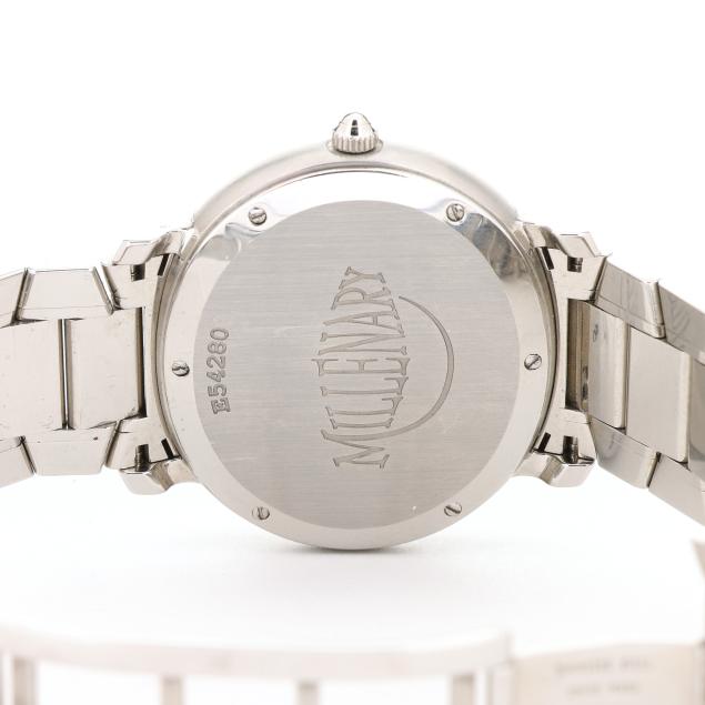 Automatic, AP 21C, big case number E54280, movement number 508998, the stainless steel oval case with polished bezel, the signed white dial with blue Arabic numeral hour markers, blued steel sword hands, and date window at 3:00 hour, the stainless steel bracelet with brushed and polished links completed with a signed butterfly clasp, the caseback numbered and marked Millenary.