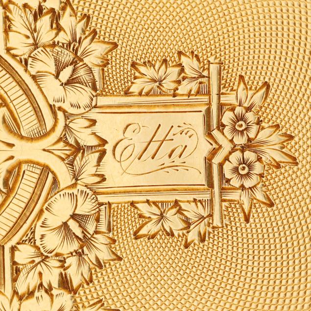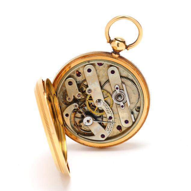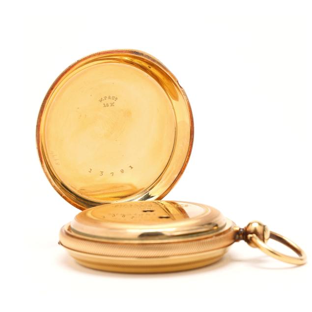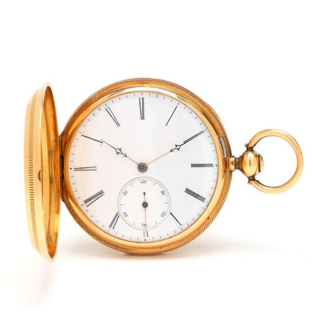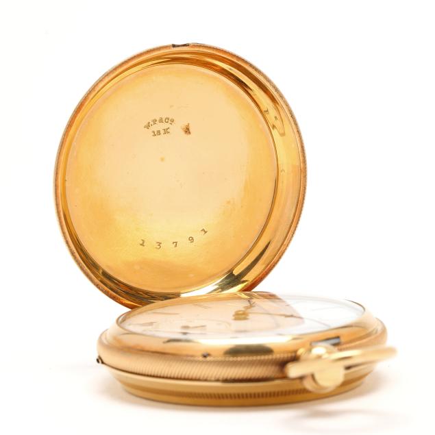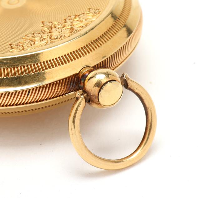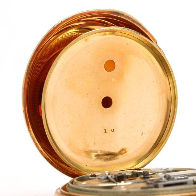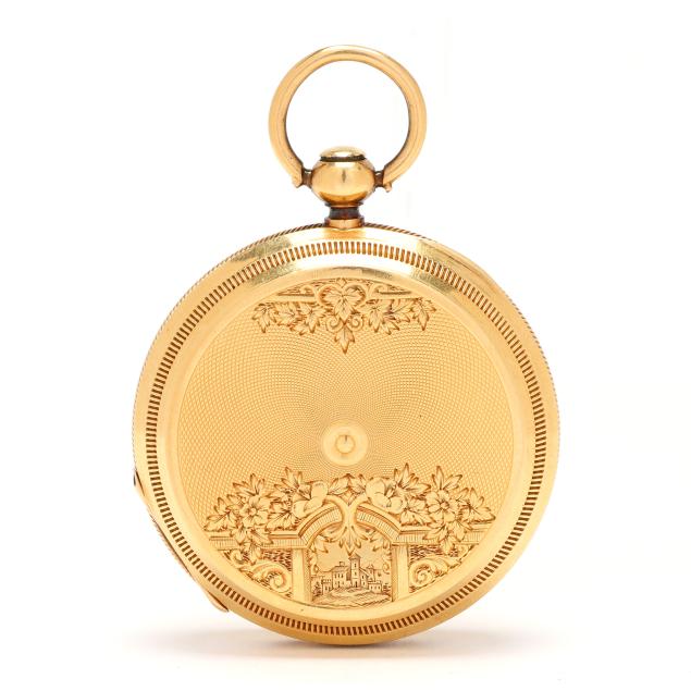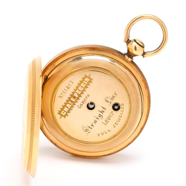 Key set and wind, serial number 11817, the gold case with scrolled, foliate, floral, and village scene over an engine turned ground, and with coin edge caseband, the white dial with black Roman numeral hour markers, blued steel and gold-tone filigree hands, and subsidiary second dial at 6:00 hour, the Swiss movement unsigned, the case with mark for Brooklyn Watch Case Co.'s Wheeler Parsons label, numbered 13791, and stamped and testing 18KT, the cuvette signed Chas E. Perrin / Geneva, numbered 11817, and testing 14KT.