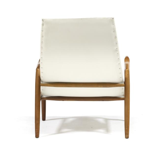 Circa 1960, walnut frame, white naugahyde upholstery with button back and seat, unmarked.