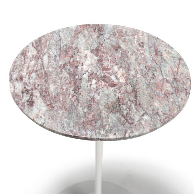 Knoll Associates, circa 1960, one part form, circular rouge marble tops with underside beveled edge, white enameled metal base, labeled.