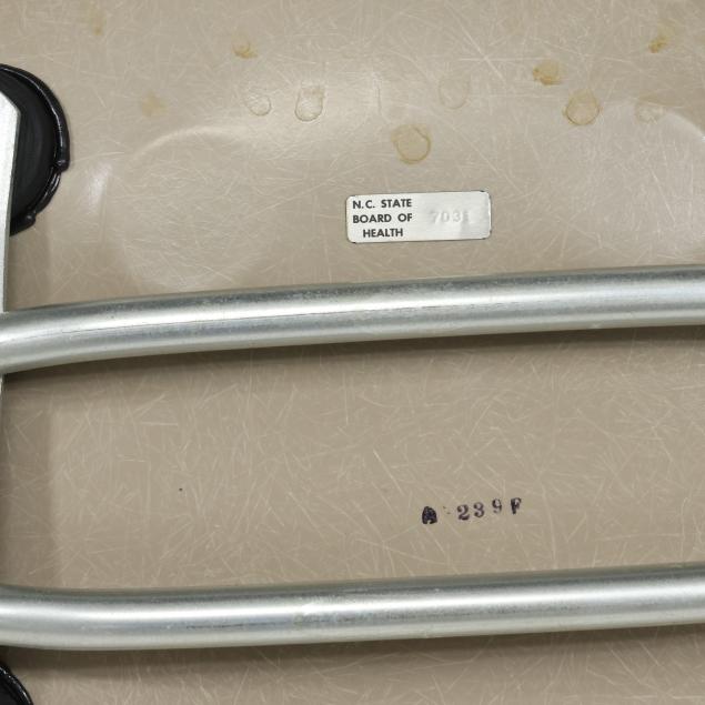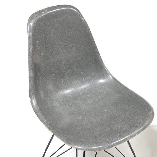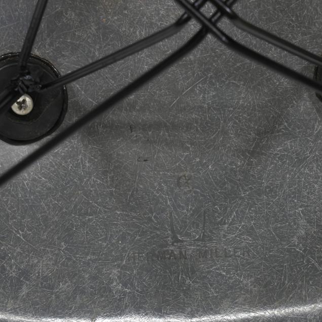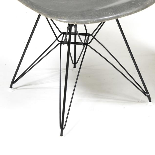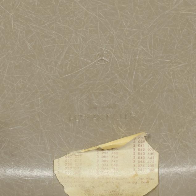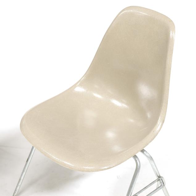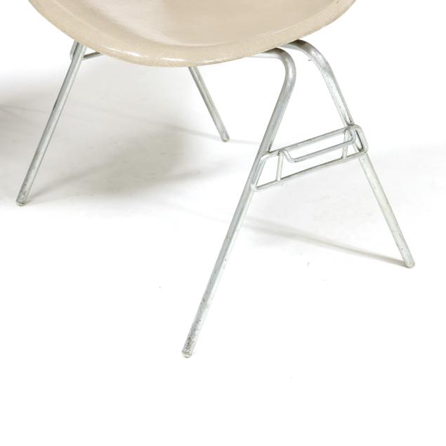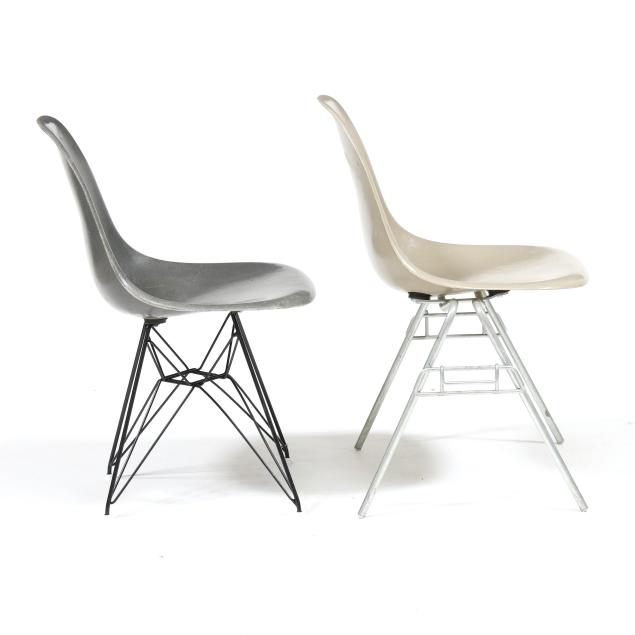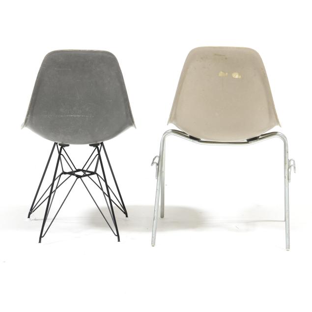 Herman Miller, circa 1960, including a tan fiberglass shell on stacking base with label for NC State Board of Health; together with a grey fiberglass shell on a black painted Eiffel Tower base with white plastic feet, both marked.