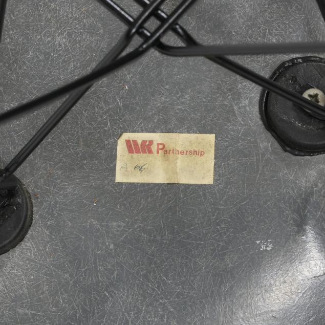 Overall good vintage condition; the tan chair with scuff to the seat and some verdigris to the legs; the grey chair with scratches to the shell and later Eiffel Tower base.