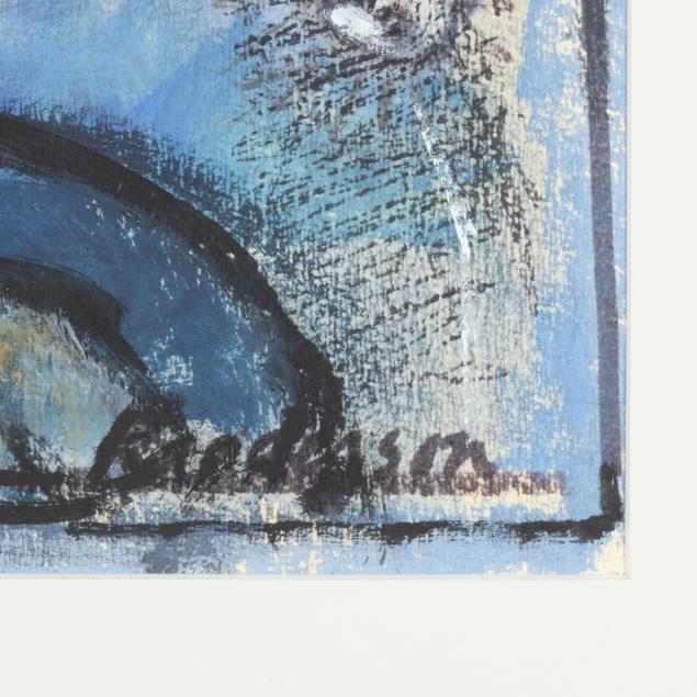 Mixed media on paper, signed at lower right, matted and framed under glass.