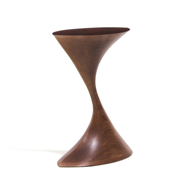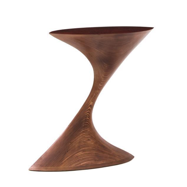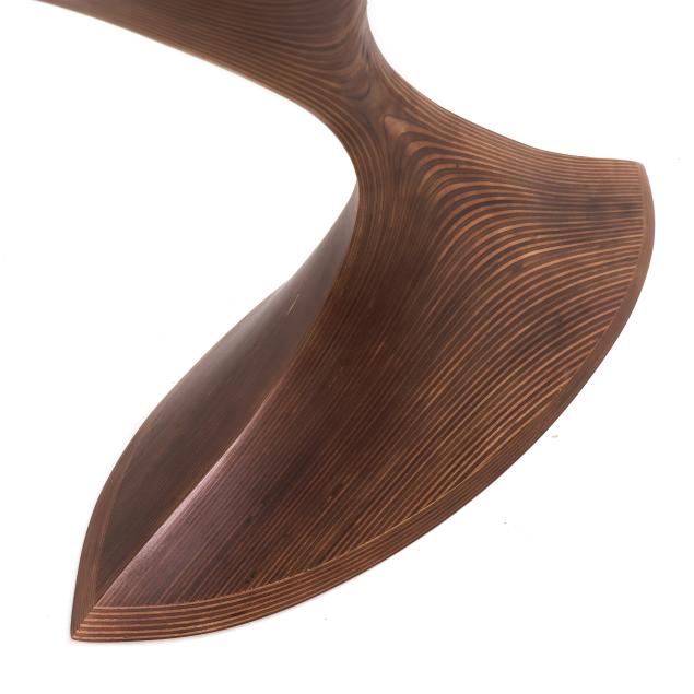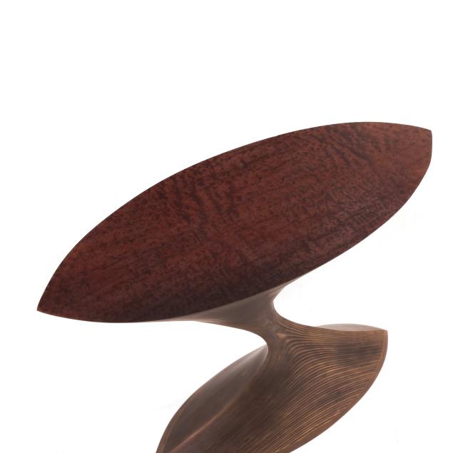 2024, marquise form top in highly figured Sapale veneer with matte finish, over a shaped multi-birch ply organic weighted base, artist signed to the underside.