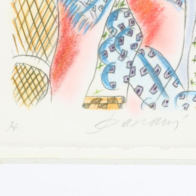 Alexandre (Alecos) Fassianos was a prominent Greek painter and printmaker known for his distinctive, stylized figures inspired by ancient Greek art and mythology. Educated at the Athens School of Fine Arts and later in Paris, his work blends classical themes with modern sensibilities, often depicting everyday scenes infused with poetic symbolism, figures with flowing hair, bicycles, and windswept forms are recurring motifs. Fassianos exhibited widely in Greece and internationally, and his work is held in major museum and private collections.