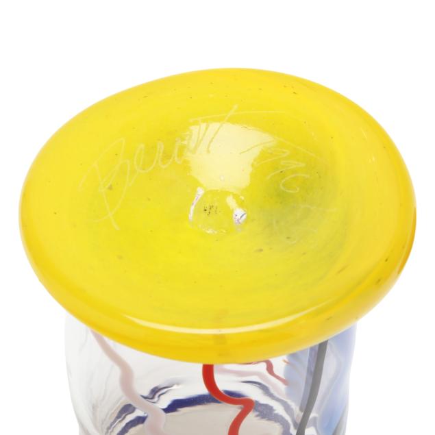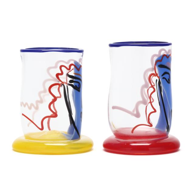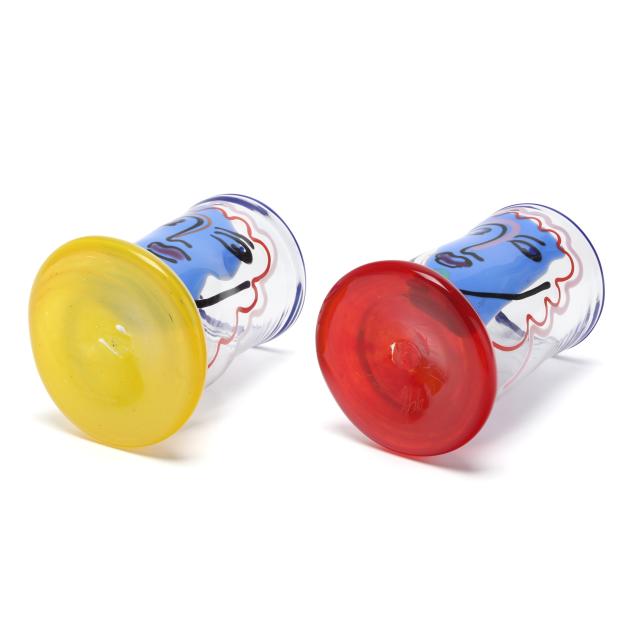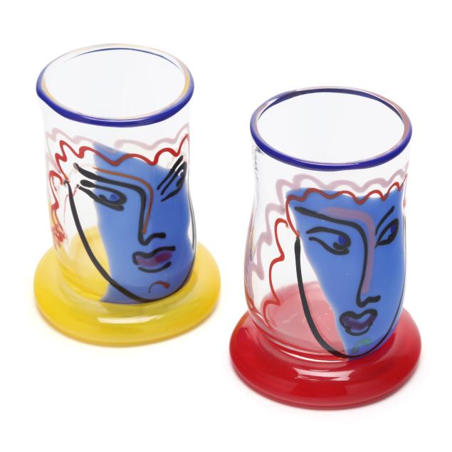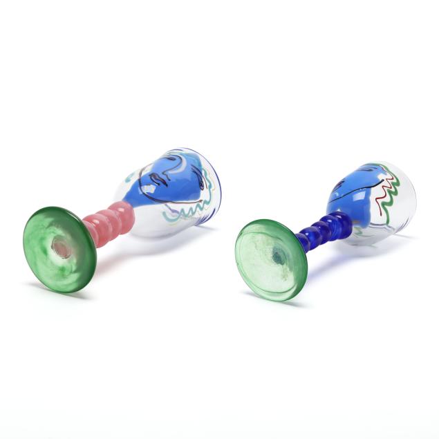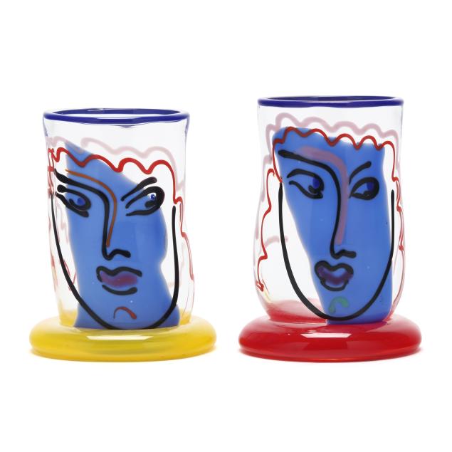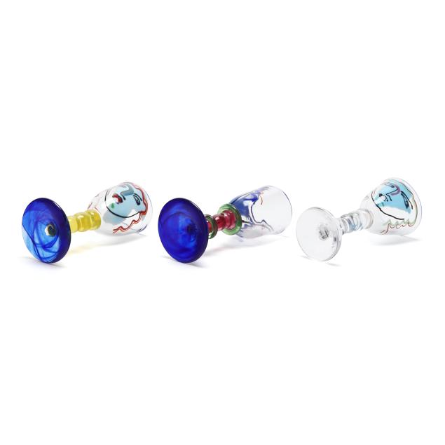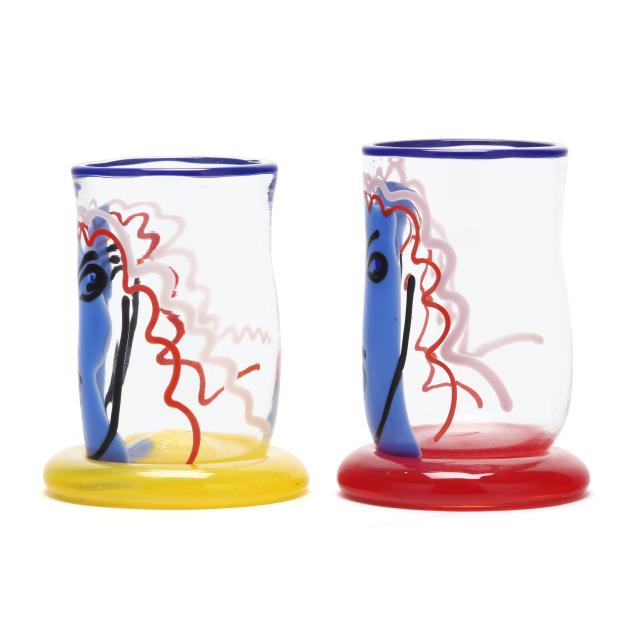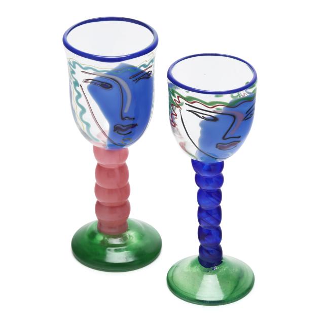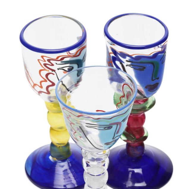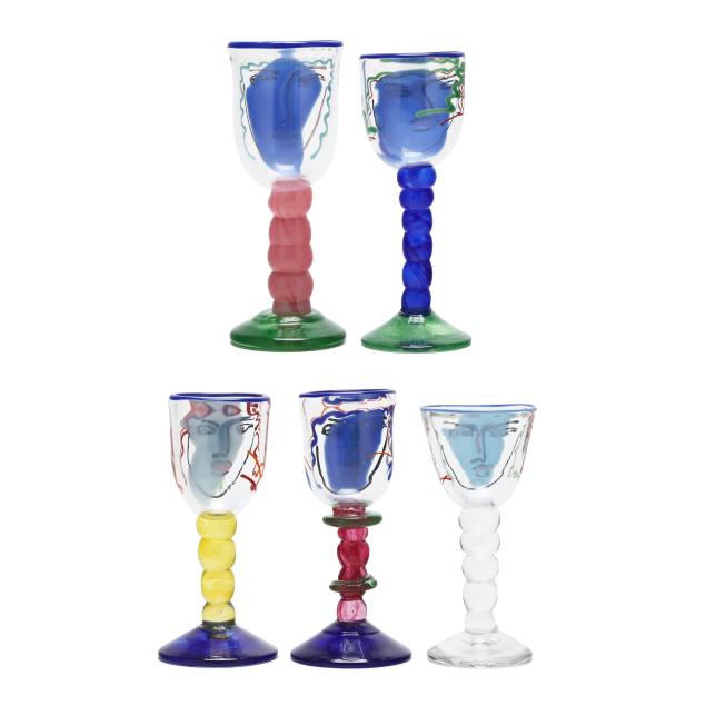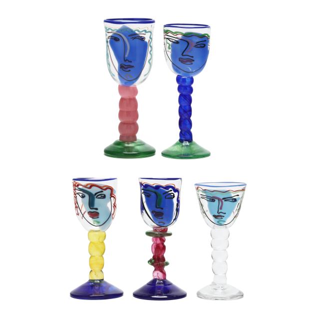1996-2003, hand-blown glass in various colors decorated with faces, including (5) goblets (ranging from 7 x 2 3/4 in. diameter to 8 1/2 x 3 1/4 in.); and (2) cups (each approximately 5 x 3 3/4 in. diameter) all inscribed "Bernst" and initialed "KB" with date to underside.