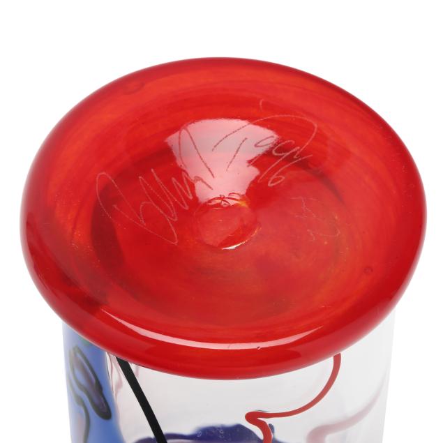 By the 80’s, both artists had established themselves as major forces in the glass world, but to keep their studio running they needed a steady flow of sales which eventually brought them together on a line of goblets and tableware. Katie supplied the imagery with melted glass colored rods, and Billy formed the result into a vessel. This combination proved very popular and received wide recognition in design journals and magazines. They continue to produce these pieces today.