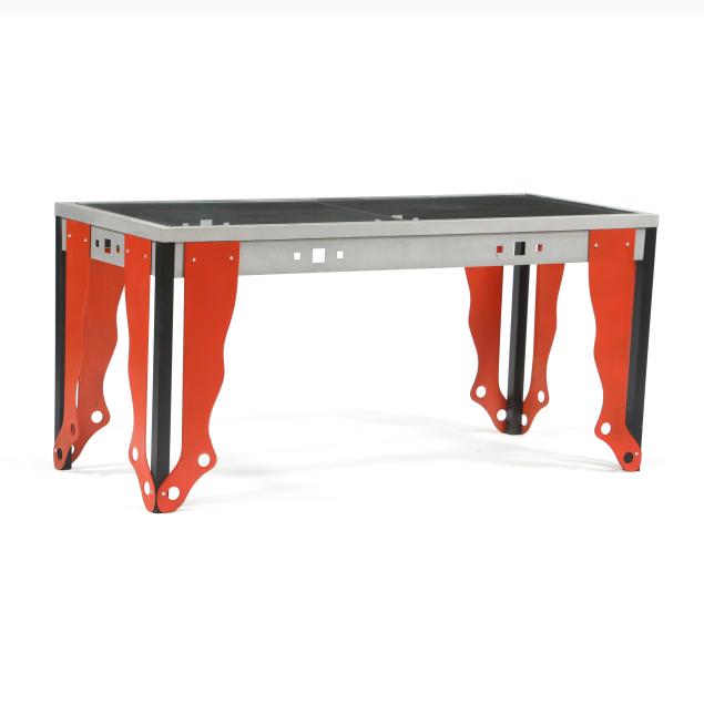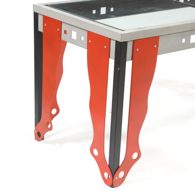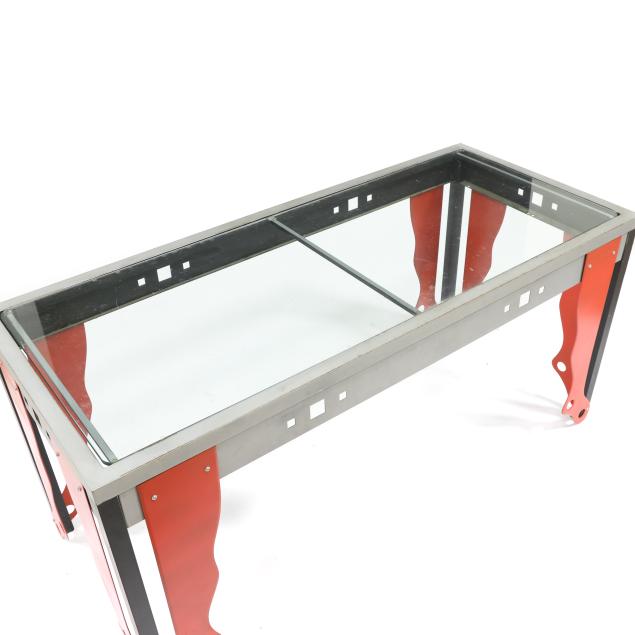 2025, painted steel, unsigned, constructed from salvaged parts, including six red-painted steel hosiery forms, industrial steel frame, with inset glass top.