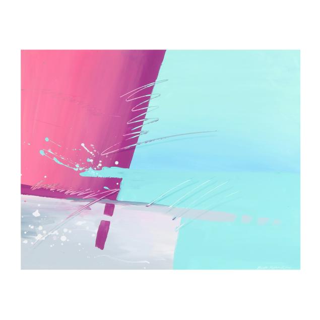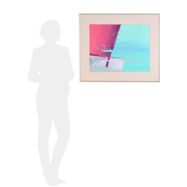Acrylic on paper, signed at lower right, matted and framed below glass.
