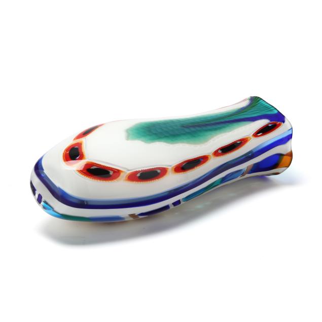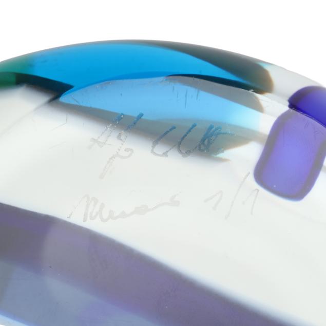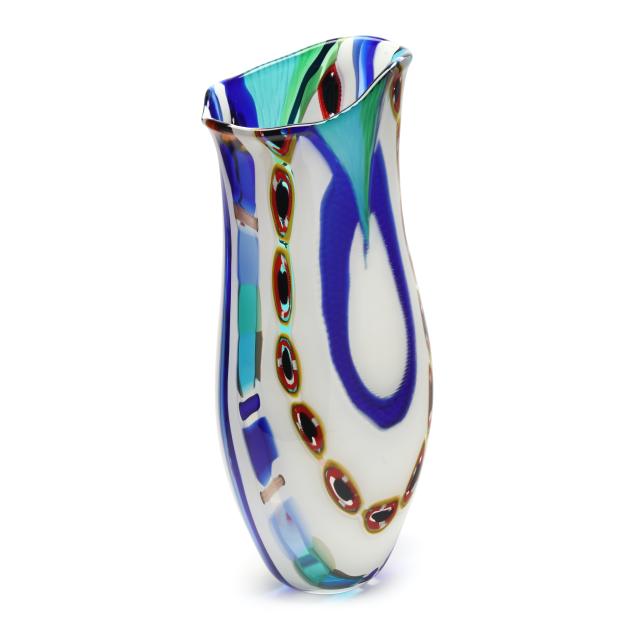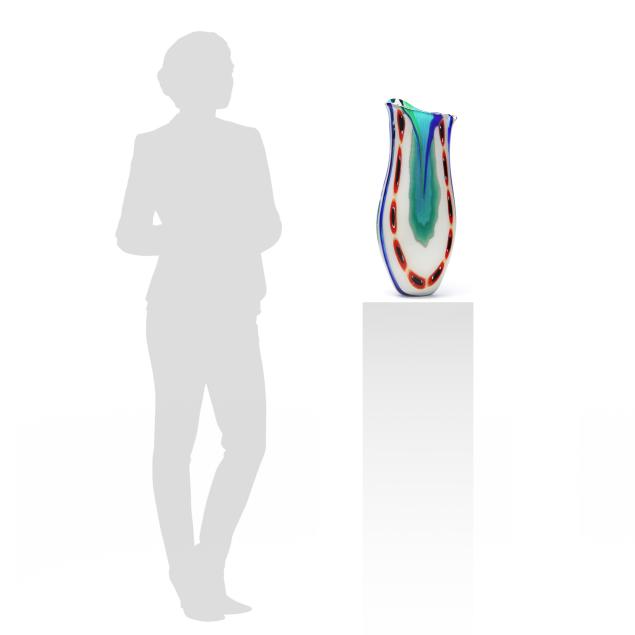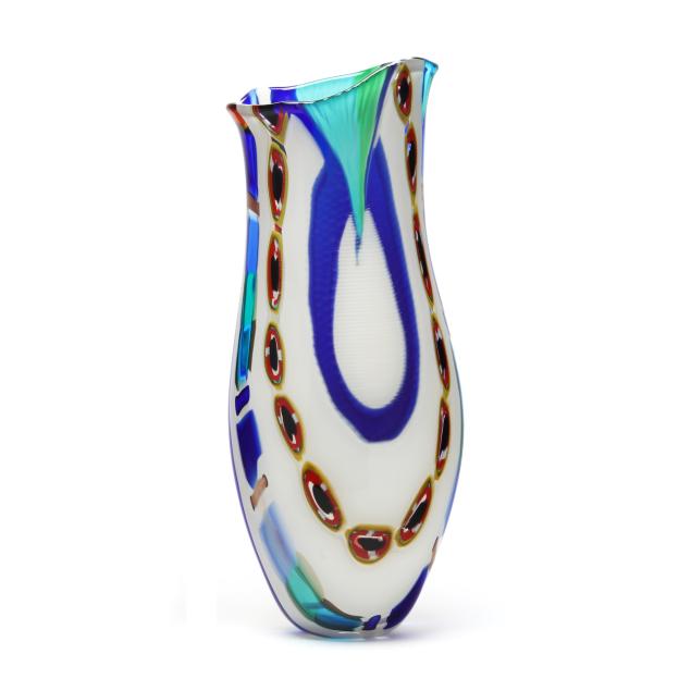 Second half 20th century, blown multi-color stretched cane vase with cold worked engraved motifs, polished pontil, signed and numbered 1/1.