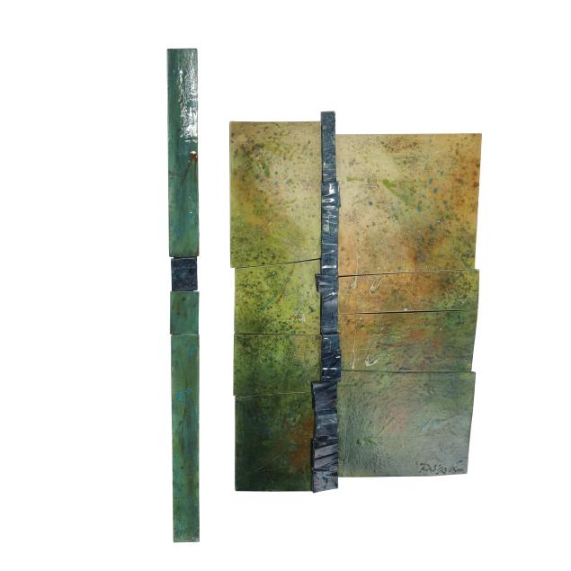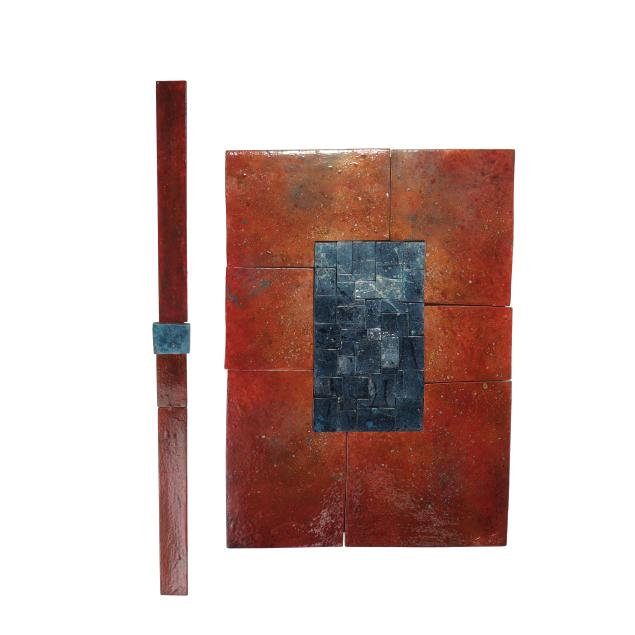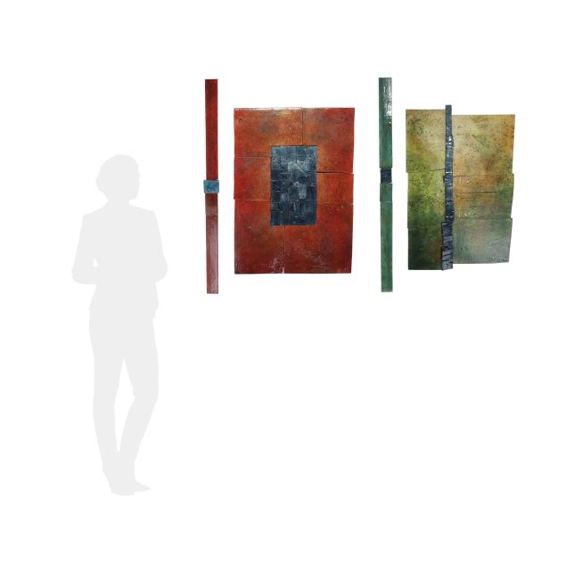 Large green panel 32 1/2 x 20 1/4 x 1 3/4 in.; thin green panel 31 1/4 x 2 1/4 x 1/2 in.; large red panel 32 3/4 x 22 1/4 x 1 3/4 in.; thin red panel 41 1/2 x 2 3/4 in.