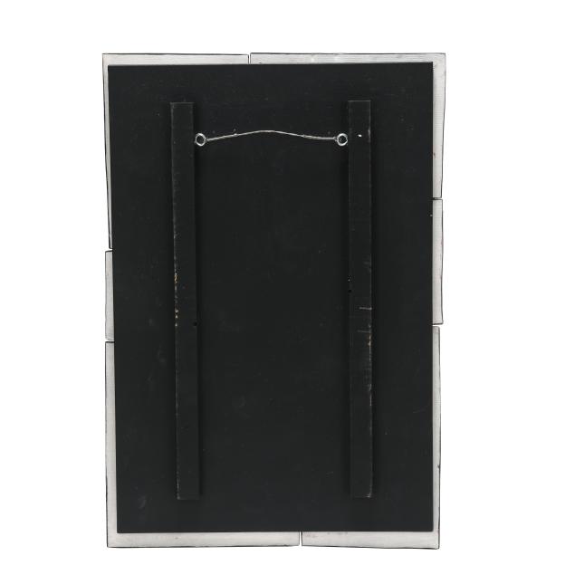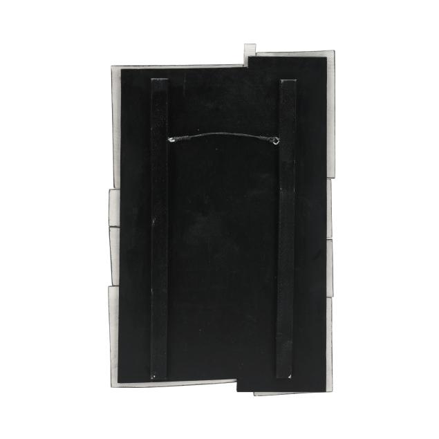 Polychrome glazed ceramic mounted to ebonized wood backing, the two larger pieces signed to lower right.