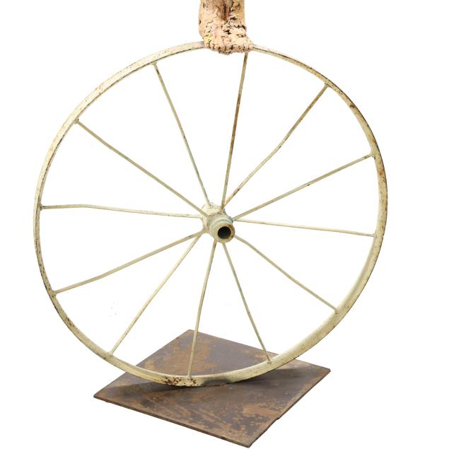 Circa 1990, hand-built and multi-glazed ceramic, metal, sculpted as a two-part tall ceramic figure with central rod mount, standing on a spoked iron wheel.