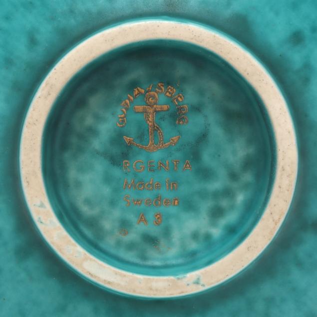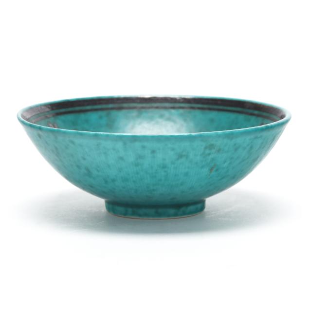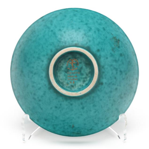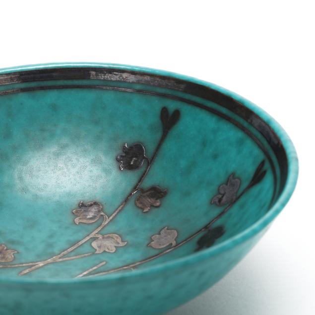 1955, model A3 stoneware bowl with mottled teal glaze, lily of the valley motif made with a mix of silver paste, turpentine, and clove oil, marked to underside.