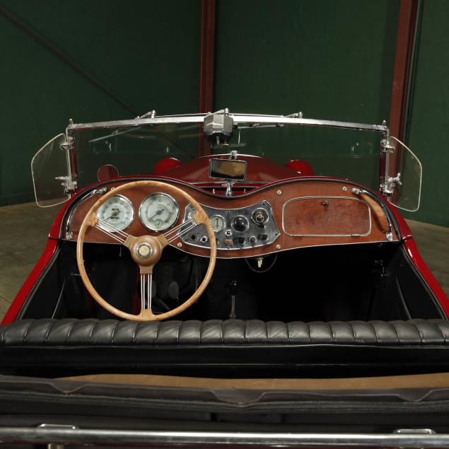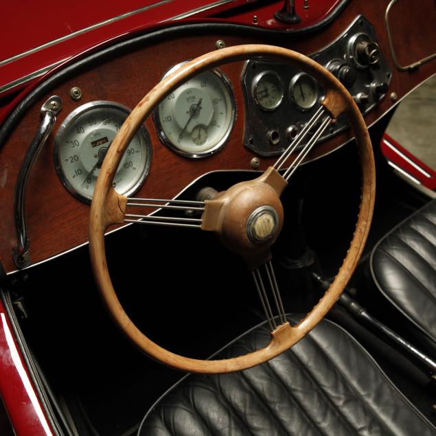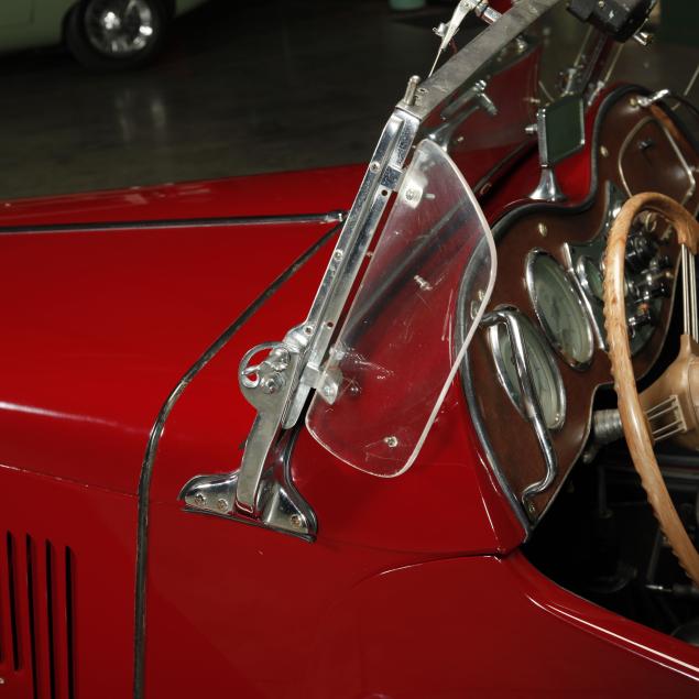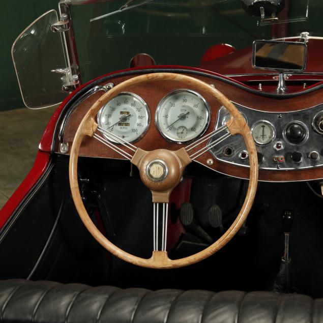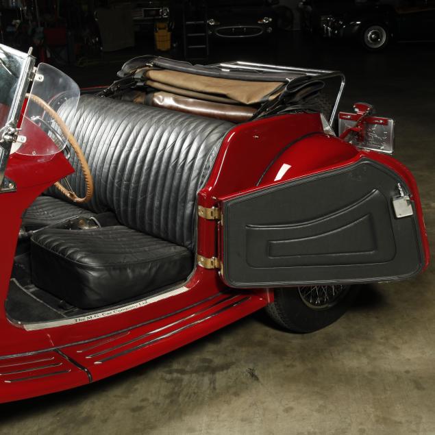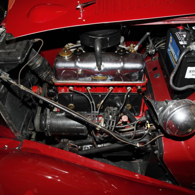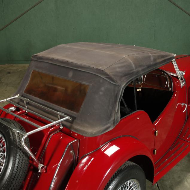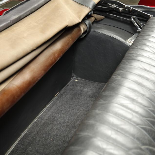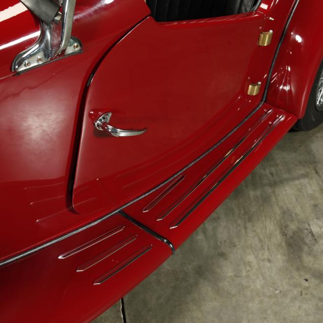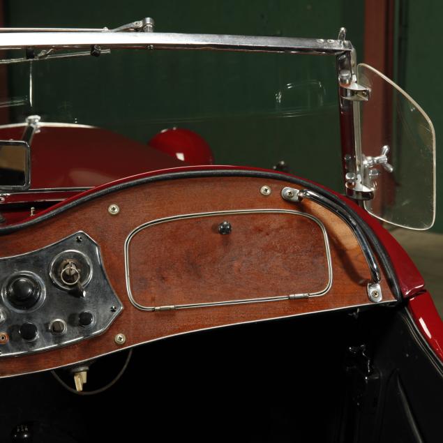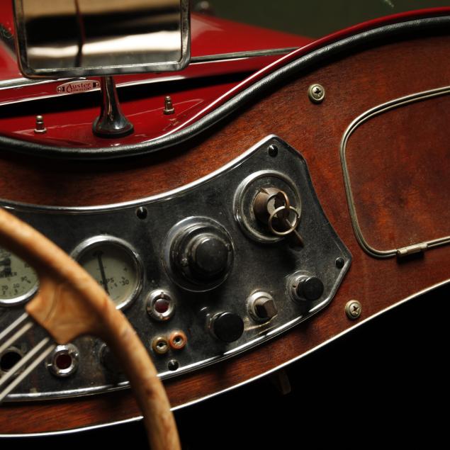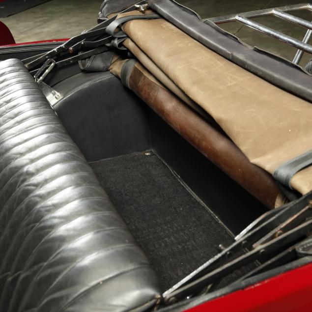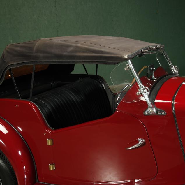 Exterior paint appears to be Tartan Red, with a black interior and top. The side screens are present. The dash is finished in real wood.