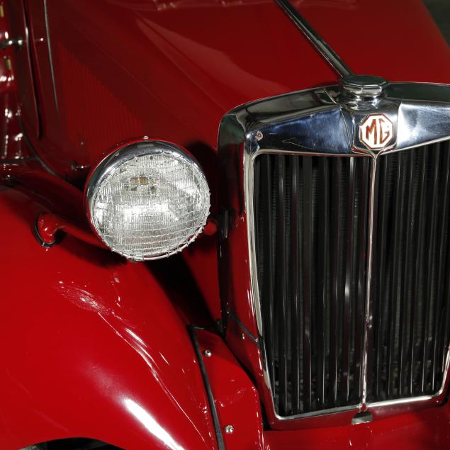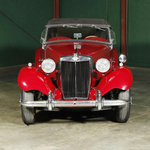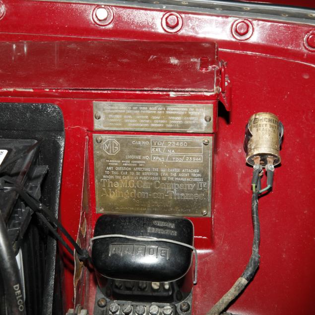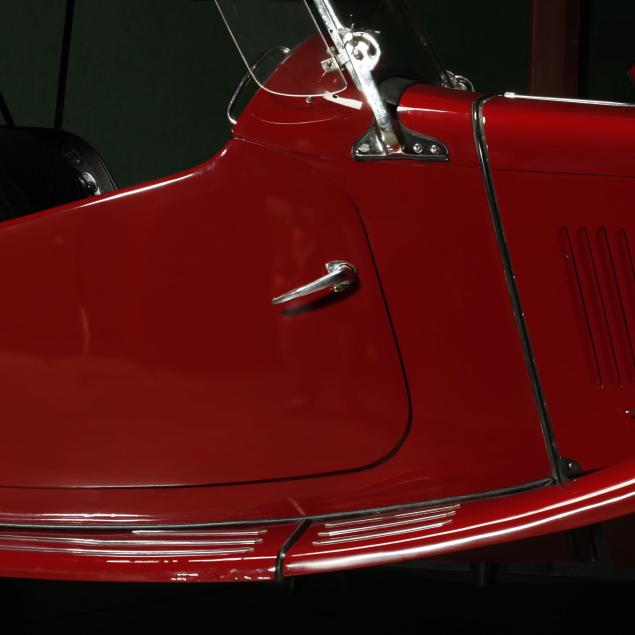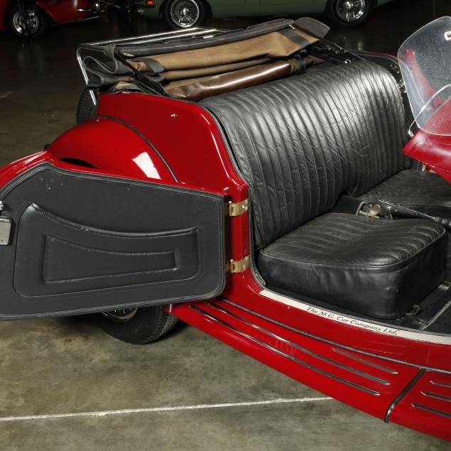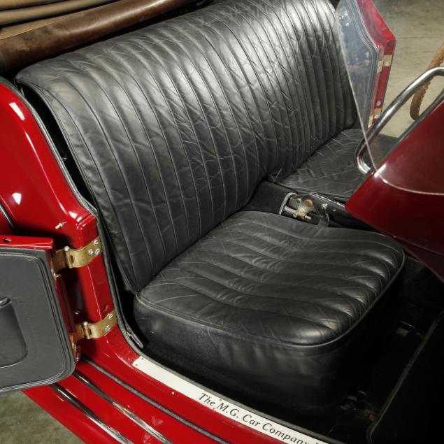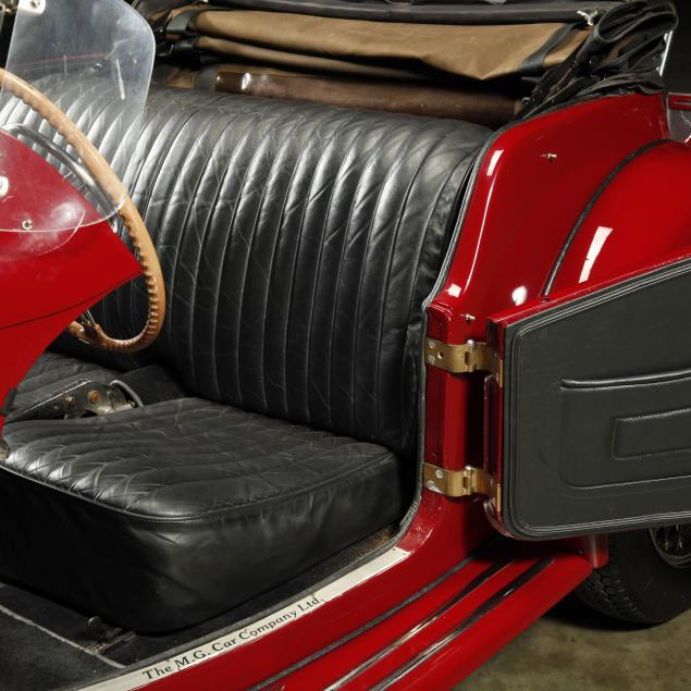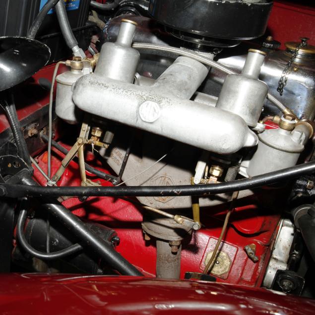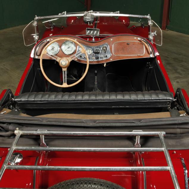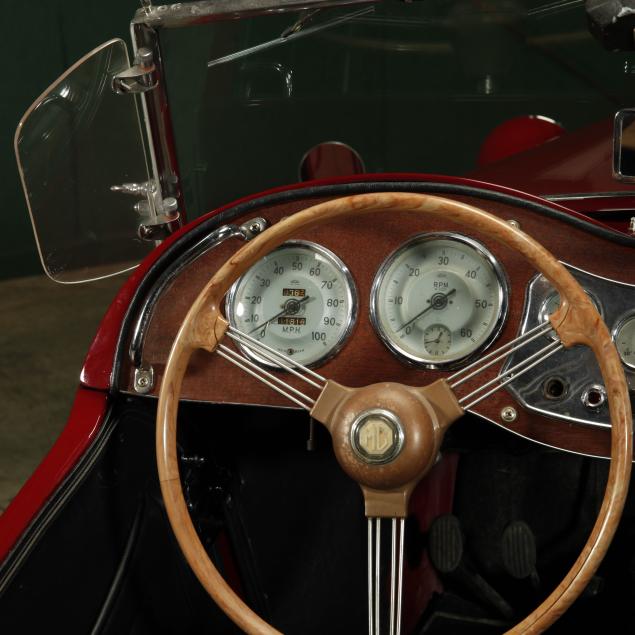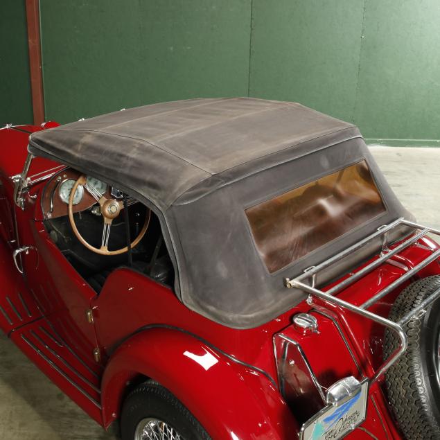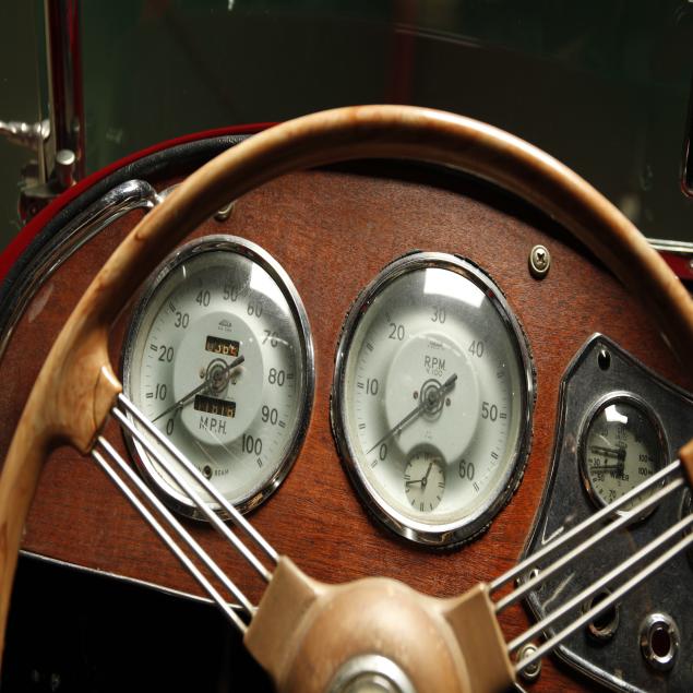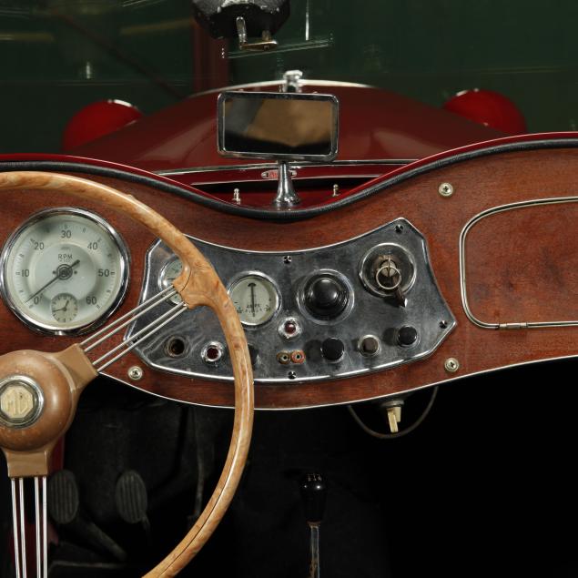 Exterior paint appears to be Tartan Red, with a black interior and top. The side screens are present. The dash is finished in real wood.