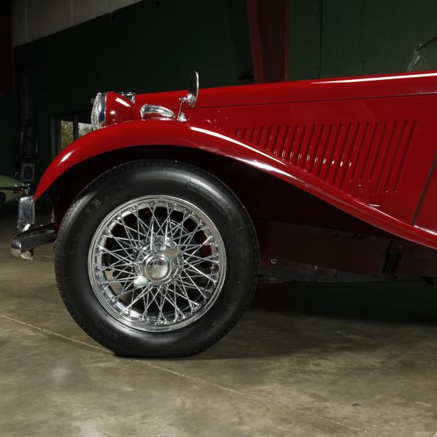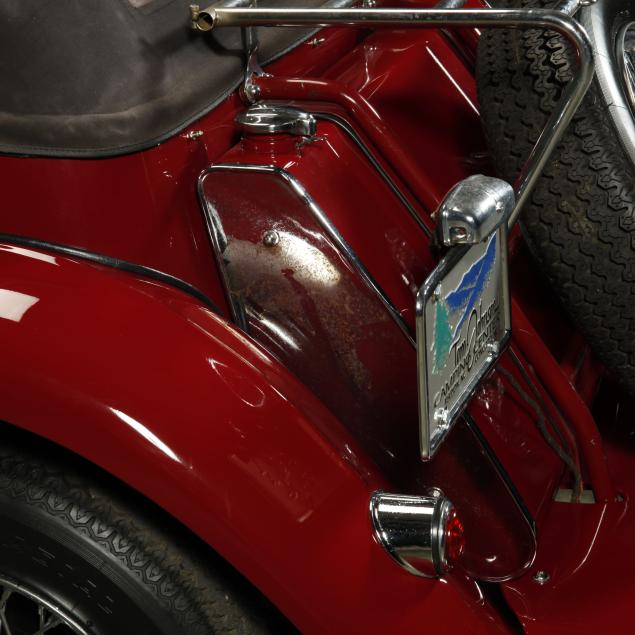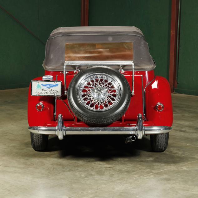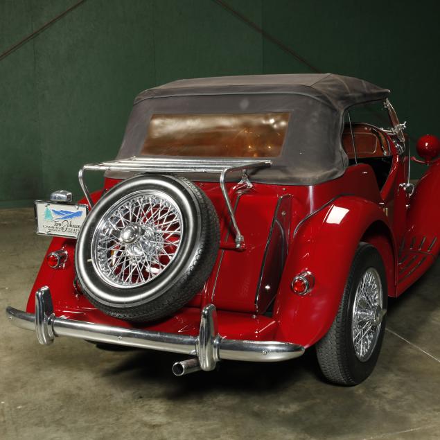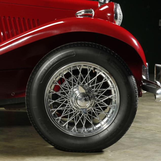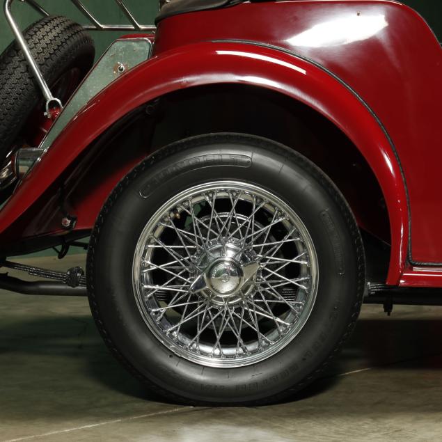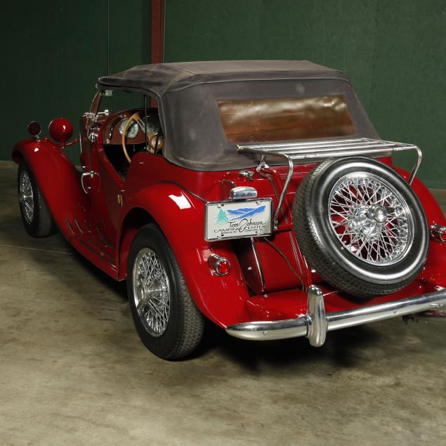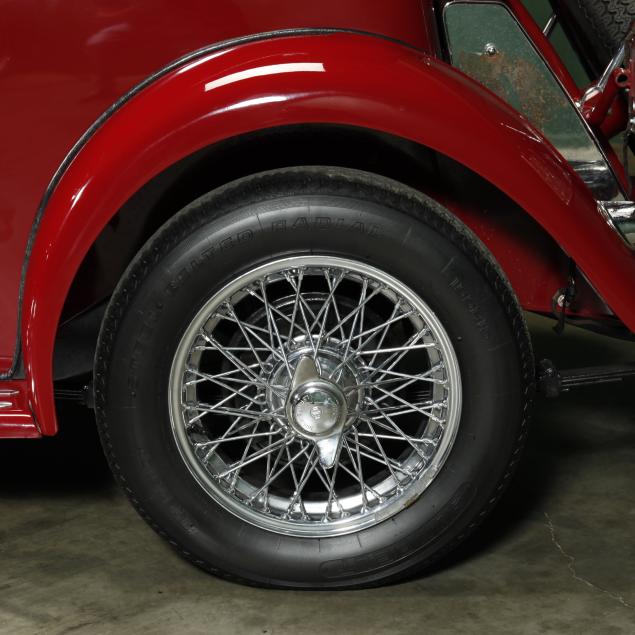 With an earlier 1250cc XPAG inline-four engine, 4-speed manual transmission, and independent front suspension. Chrome Dayton knock off wire wheels with dated Sunbelt radials are mounted, as well as the spare.