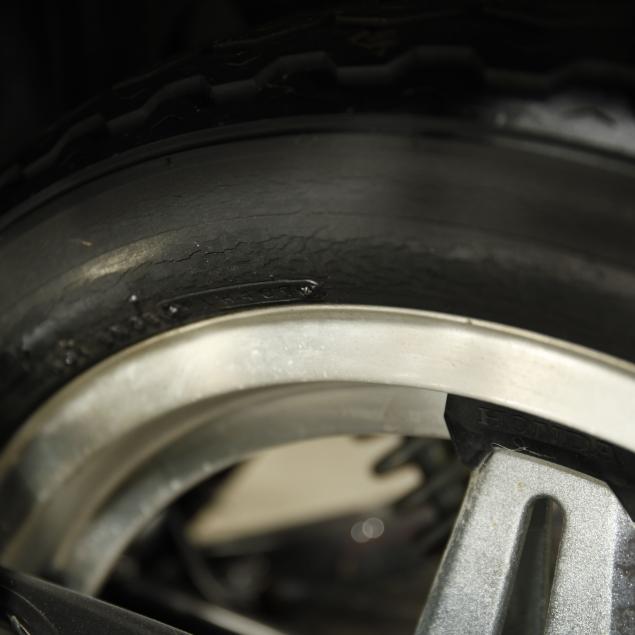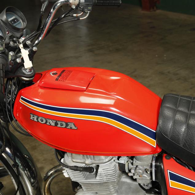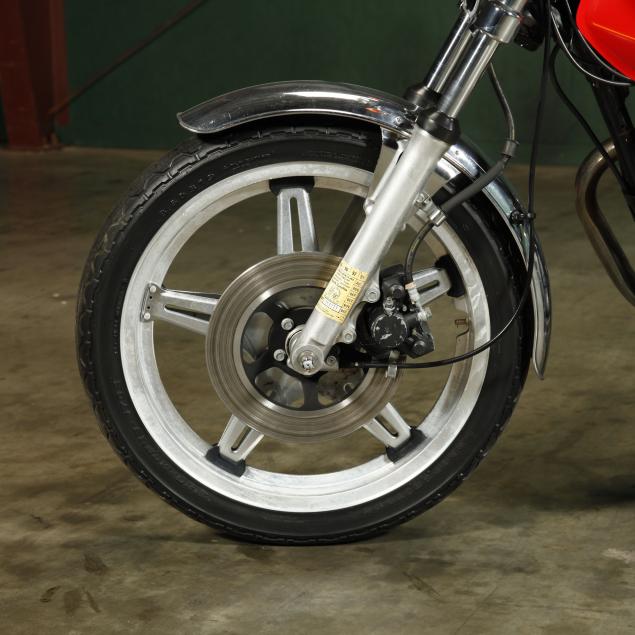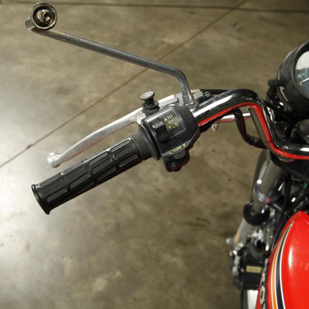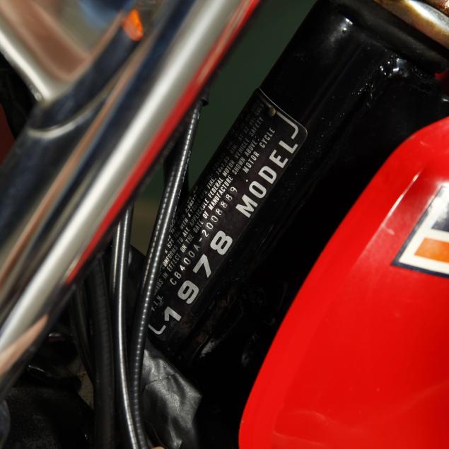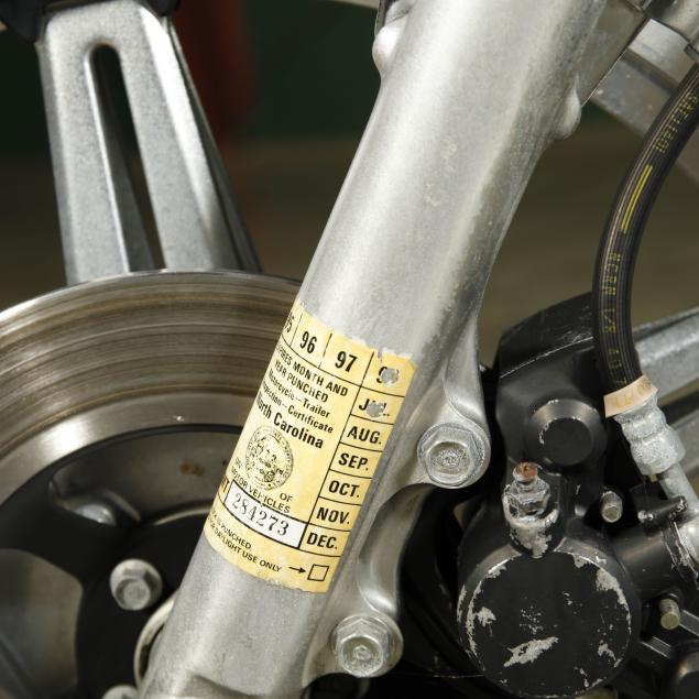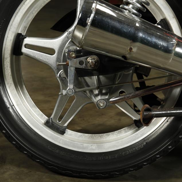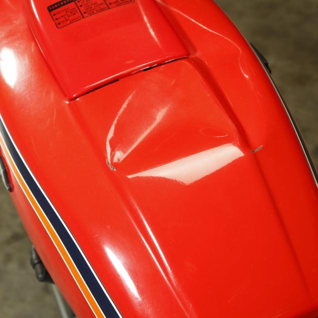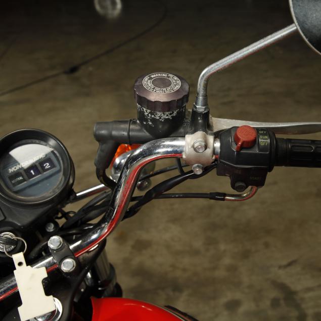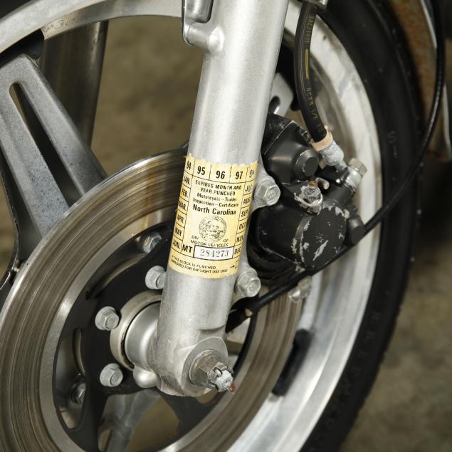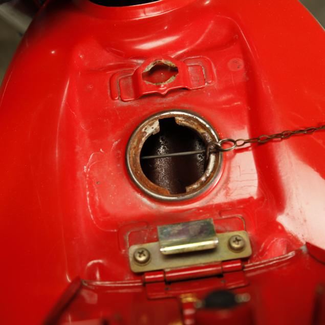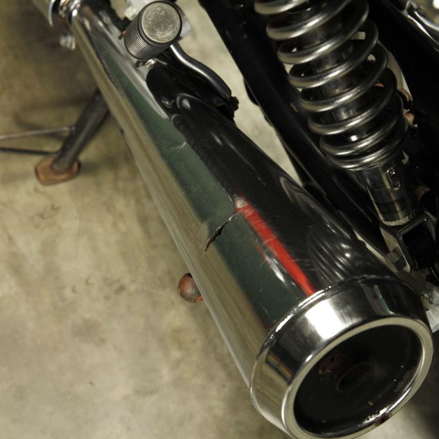 Not currently operating, overall condition unknown; engine can be kicked over; fuel tank contaminated with old fuel, areas of surface rust and other areas clear; dent to tank; parking brake cable frozen; no front brakes by lever; no other apparent concerns.