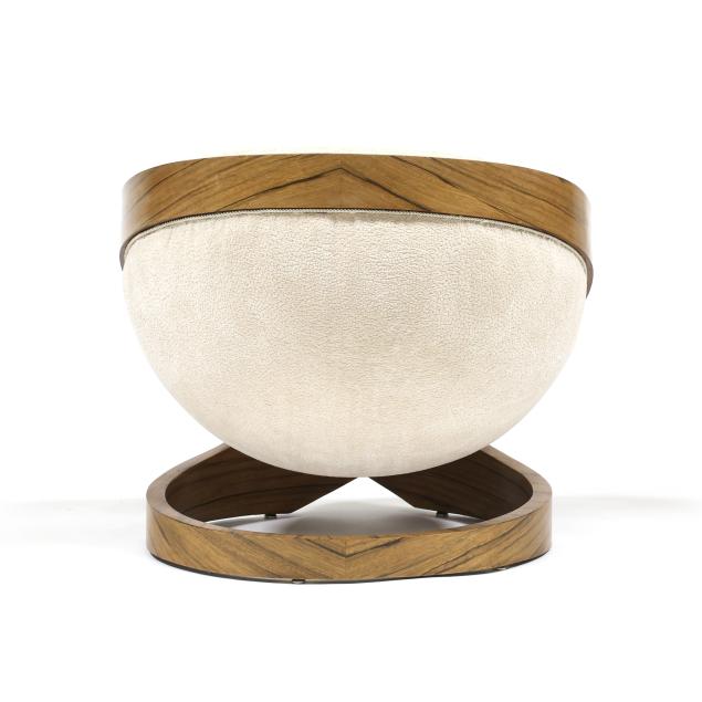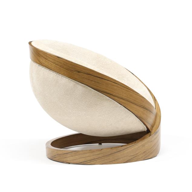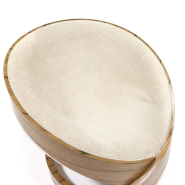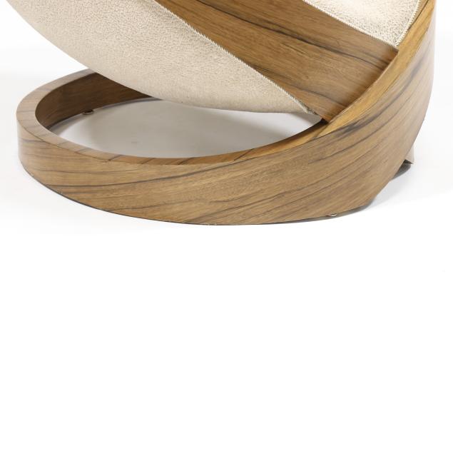Contemporary, rosewood veneer, cantilevered design, cream boucle upholstery, unmarked.