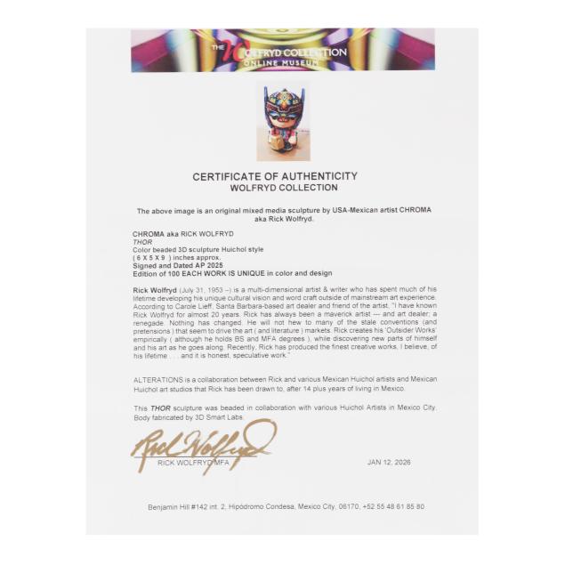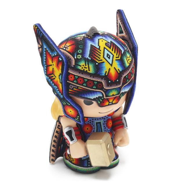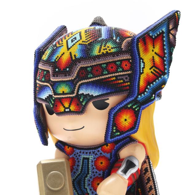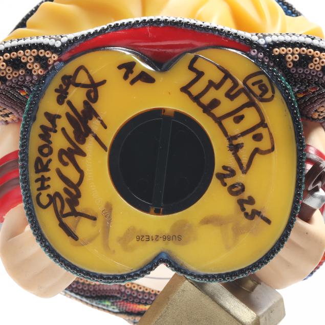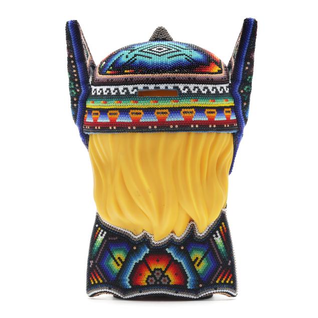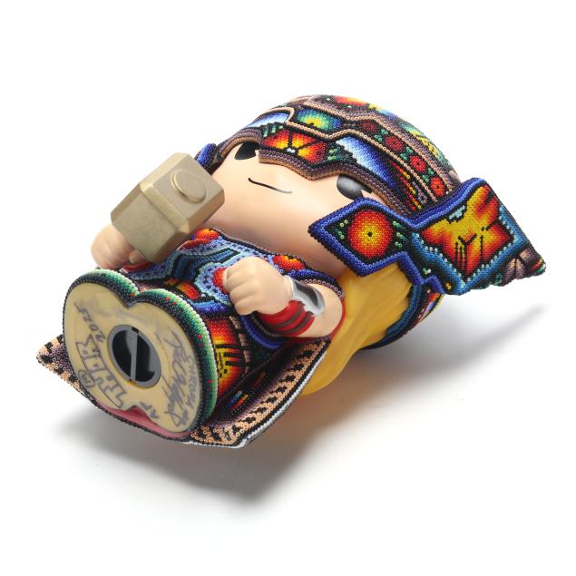 2025, artist proof from an edition of 100, ink signed, numbered AP and dated to the underside, large Huichol style color beaded 3D sculpture of Thor piggy bank, uniquely colored and designed in collaboration with various Huichol artists in Mexico city. Included with the Lot is a signed certificate of authenticity by the artist.
