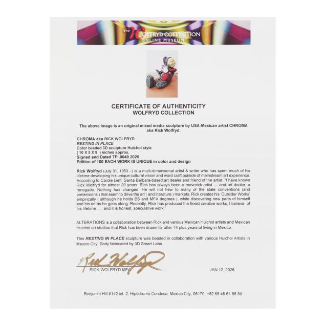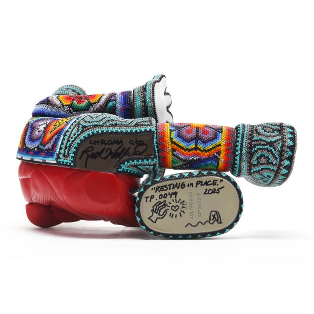 2025, from an edition of 100, ink signed, numbered TP.0049 and dated to the underside, large Huichol style color beaded 3D sculpture, uniquely colored and designed in collaboration with various Huichol artists in Mexico city. Included with the Lot is a signed certificate of authenticity by the artist.