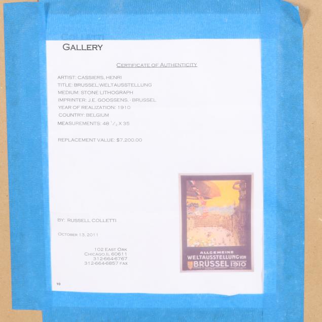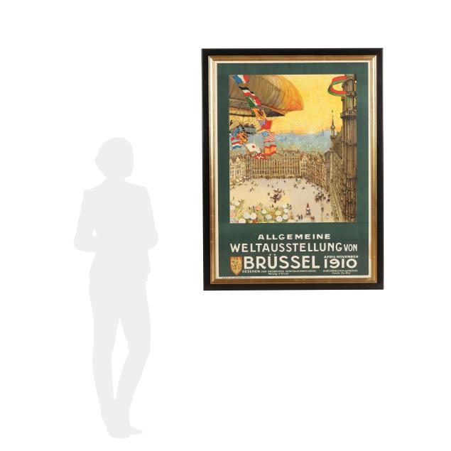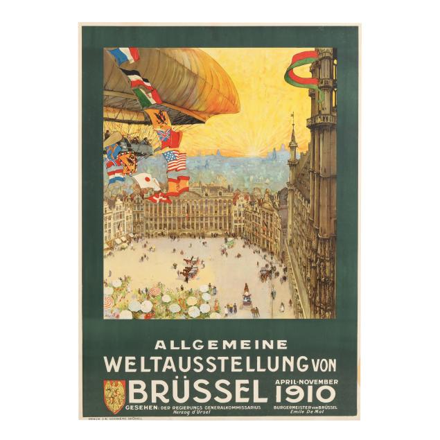 Lithographic poster in colors, 1910, for the World's Fair, printed by J.E. Goossens, Bruxelles, Paris, Lille; framed below glass, retaining paperwork.