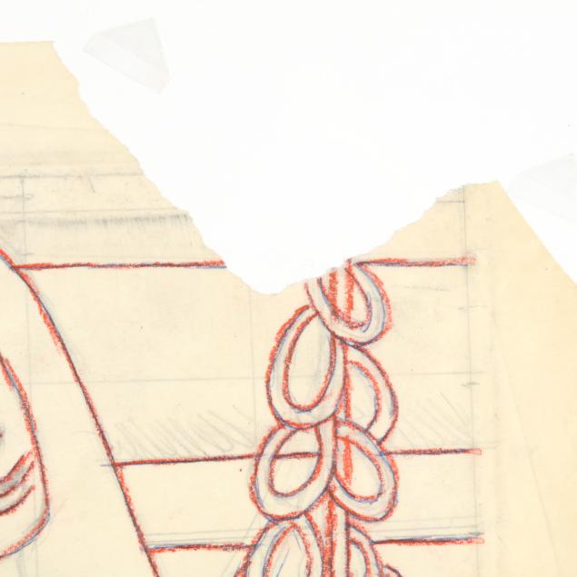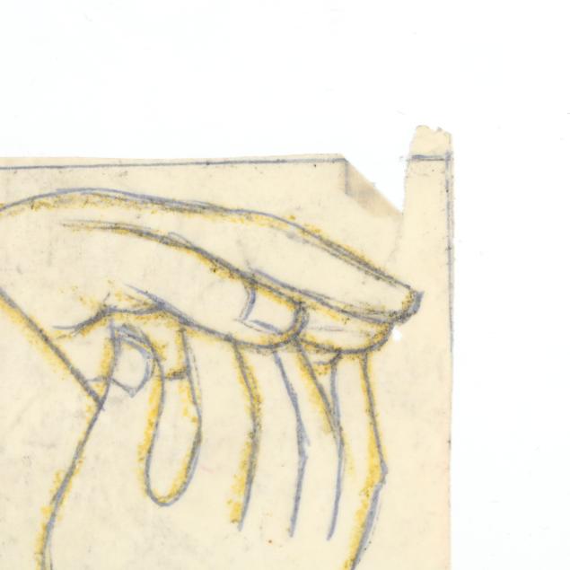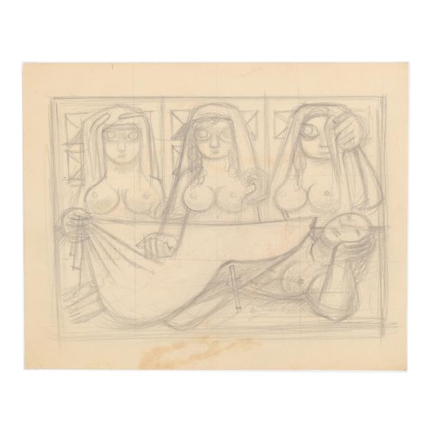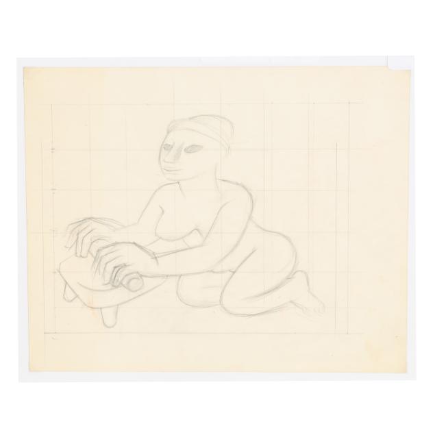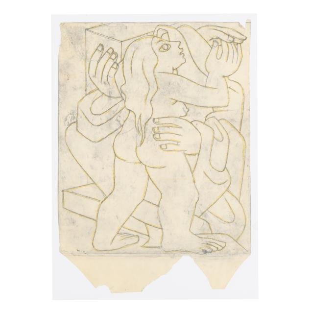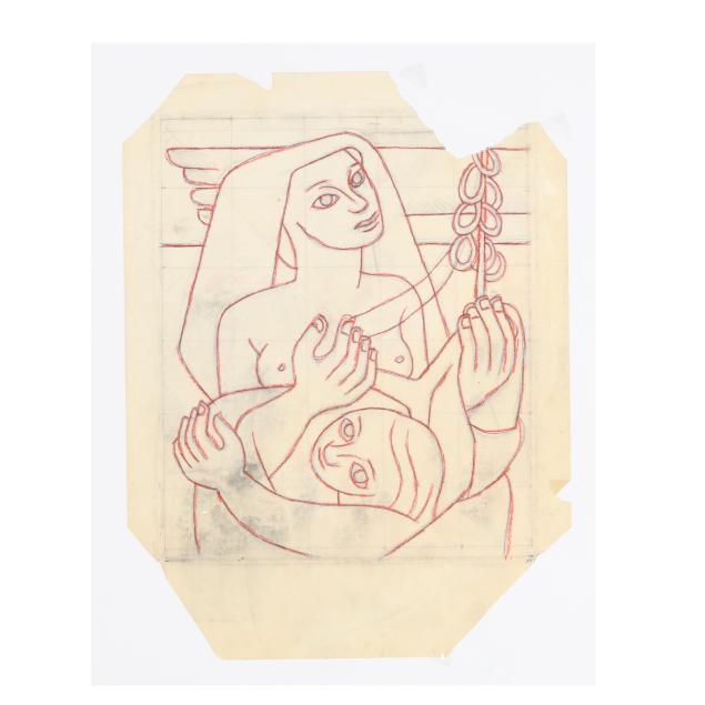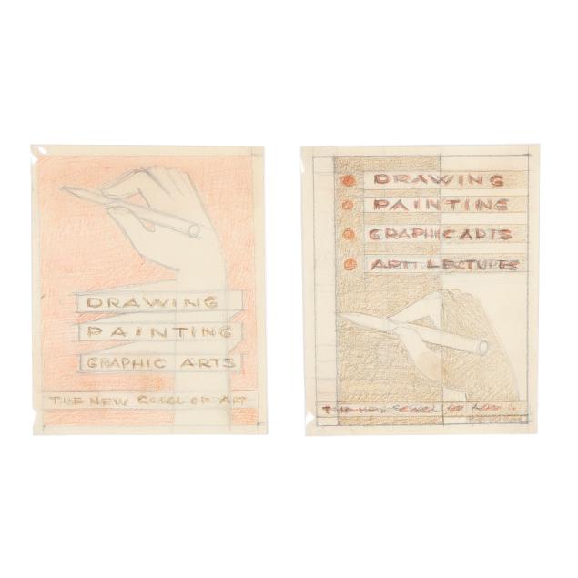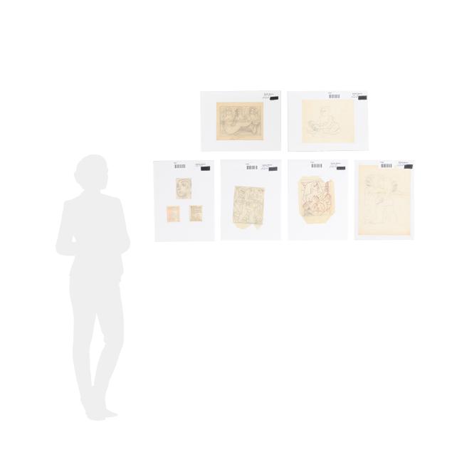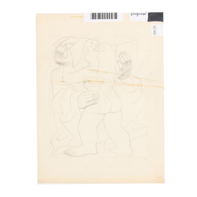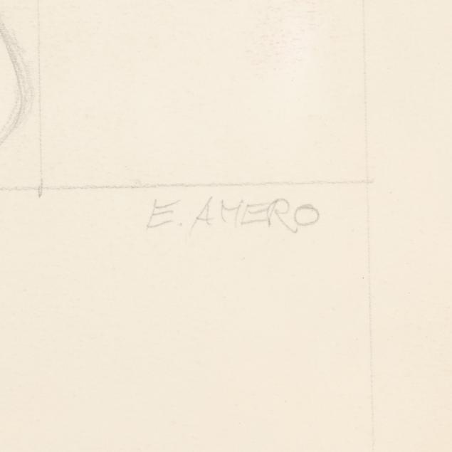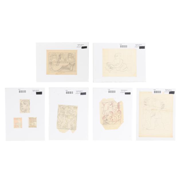 The first a pencil sketch on paper of four women, unsigned (9 1/2 x 11 3/8 in.); the second an ink and color sketch on paper of two figures embracing, unsigned; the third an ink and color sketch on paper of two figures, unsigned; the fourth a sketch of two figures embracing, signed "E. Amero" at lower right (17 1/2 x 13 in.); the fifth and sixth are two designs in pencil and crayon for cover sheets for lectures at The New School of Art, unsigned (4 x 3 1/4 in. each); the seventh a pencil sketch of a woman's head, unsigned 5 1/4 x 3 3/4 in.); and the eighth a sketch of a woman kneeling, unsigned (10 3/4 x 13 in.).