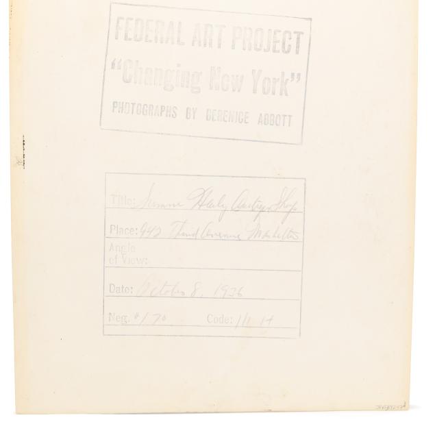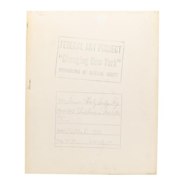Gelatin silver print, 1936, with the photographer's Federal Art Project / 'Changing New York' stamp to verso, also titled, dated, and annotated in pencil, negative 170, unframed.