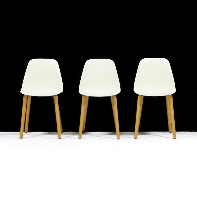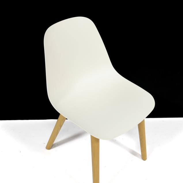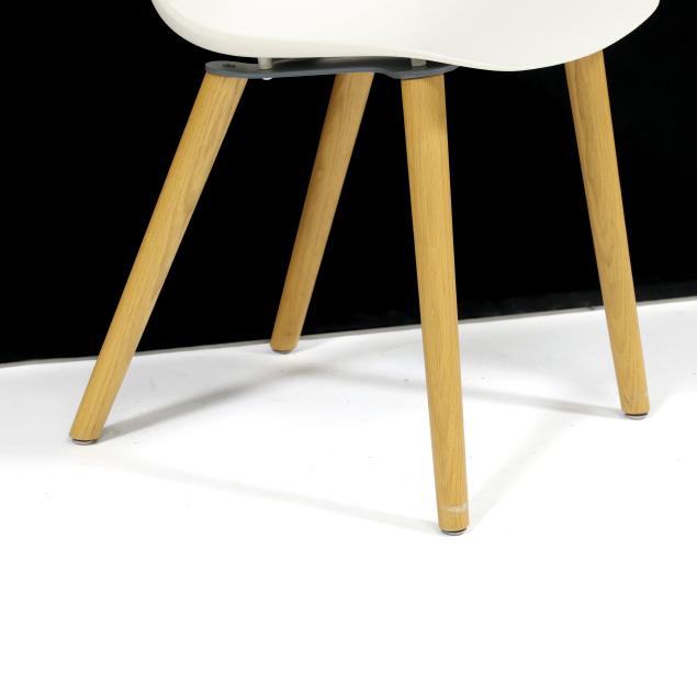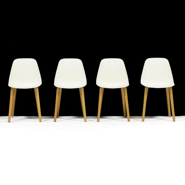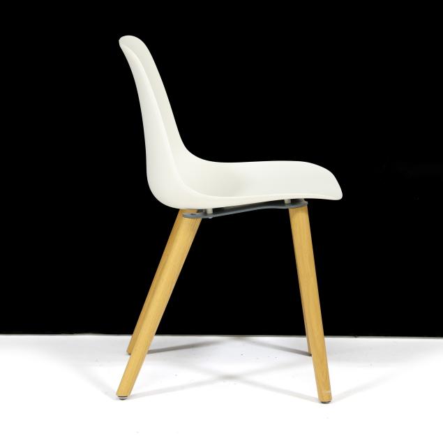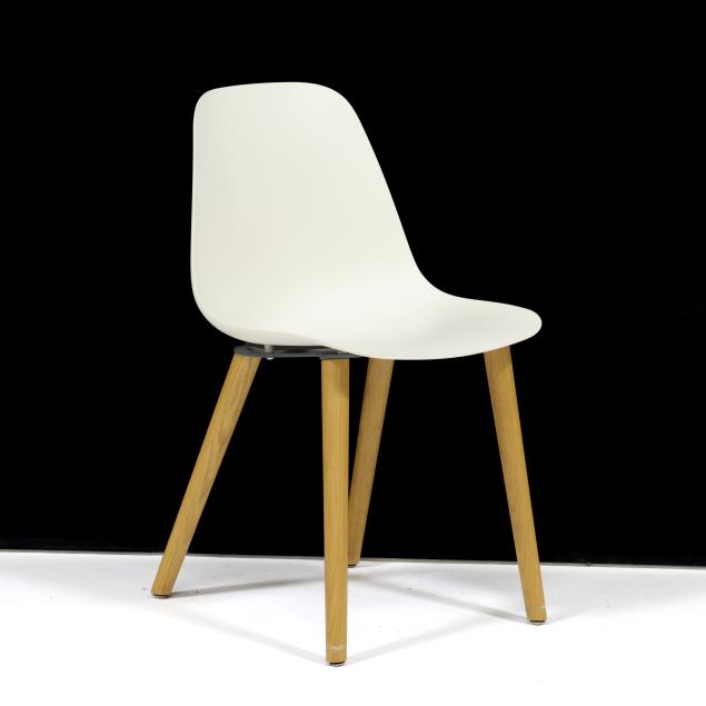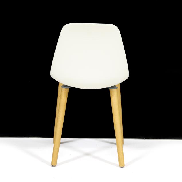 LC Modern, contemporary, white shells on turned ash legs, labeled.